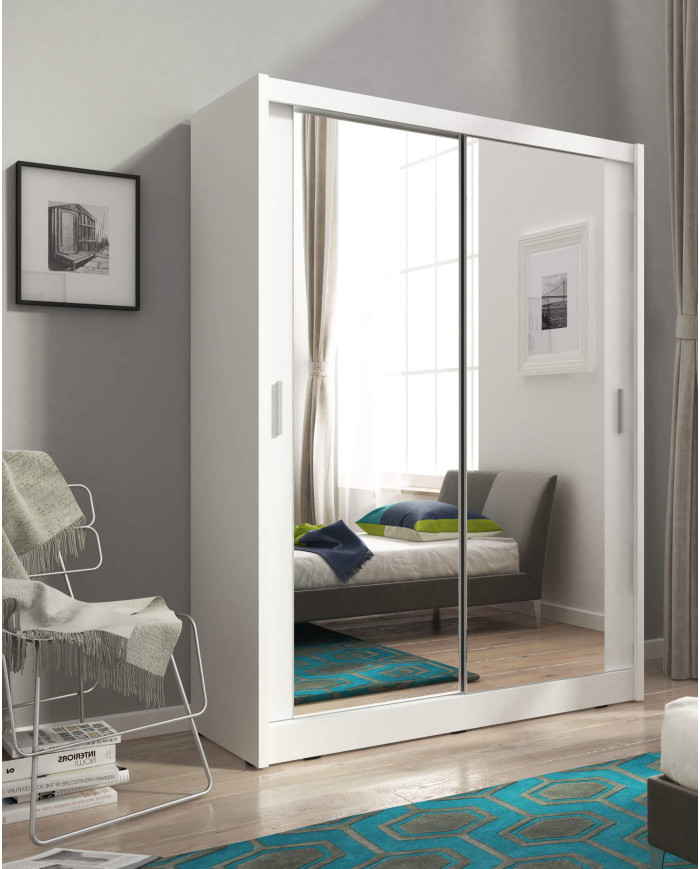 Maja 2 spinta, dvidurė, 130 cm, stumdoma, lentynos, pakaba, veidrodžiai, balta