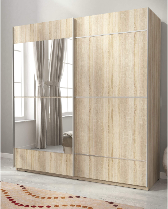 Mika 4 spinta, dviejų durų, 200 cm, stumdomos, lentynos, pakaba, veidrodis, Sonoma ąžuolas