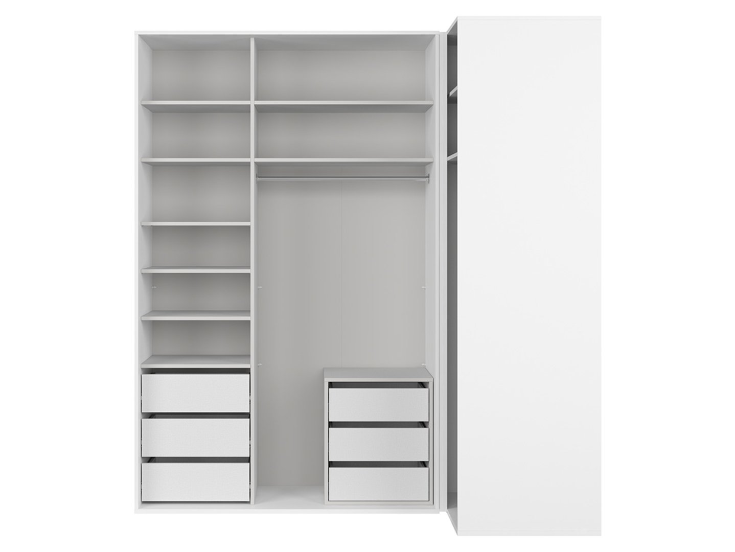 „Flex“ spinta – moderni spinta, kuri palengvina tvarką. Jei svarstote, kaip geriausiai išnaudoti kampelį miegamajame ar vaikų kambaryje, moderni ir erdvi kampinė „Flex“ spinta gali būti kaip tik jums. Ją sudaro du moduliai, sujungti kartu, sudarantys apverstą L formą. Dėl stumdomų fasadų pasiekti daugumą spintos daiktų yra itin lengva. Spintoje yra pilno ištraukimo stalčiai su švelnaus uždarymo mechanizmais. Papildomas LED apšvietimas su judesio jutikliu palengvina naršymą lentynose ir stalčiuose. Ši erdvi spinta pasižymi paprastu ir minimalistiniu dizainu. Fasadai ir korpusas yra apdailinti šviesia, prislopinta spalvų gama – blizgia balta. Vienas iš spintos segmentų pasižymi veidrodiniais fasadais su subtiliais grioveliais, suteikiančiais spintai elegantišką charakterį. Spintos vidus apdailintas praktiška pilka drobe. Jei norite, kad jūsų miegamasis atrodytų didesnis ir šviesesnis, moderni spinta su šiek tiek blizgiu fasadu gali patenkinti jūsų lūkesčius. Veidrodinės panelės yra ne tik praktiškos, bet ir dekoratyvios, subtiliai atspindinčios šviesą. „Flex“ spintos suteikia tikrą lankstumą – rinkitės paruoštą sprendimą arba naudokite konfigūratorių, kad pritaikytumėte spintą pagal savo individualius poreikius. Gylis neapima fasadų storio – jis taikomas tik korpusui su varstomomis durimis.