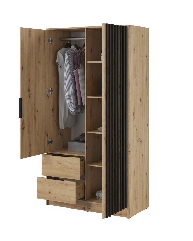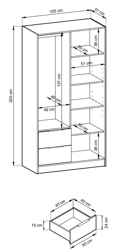 Spinta turi du fasadus: vieną su drabužių kabykla, kitą su lentynomis ir du papildomus stalčius.