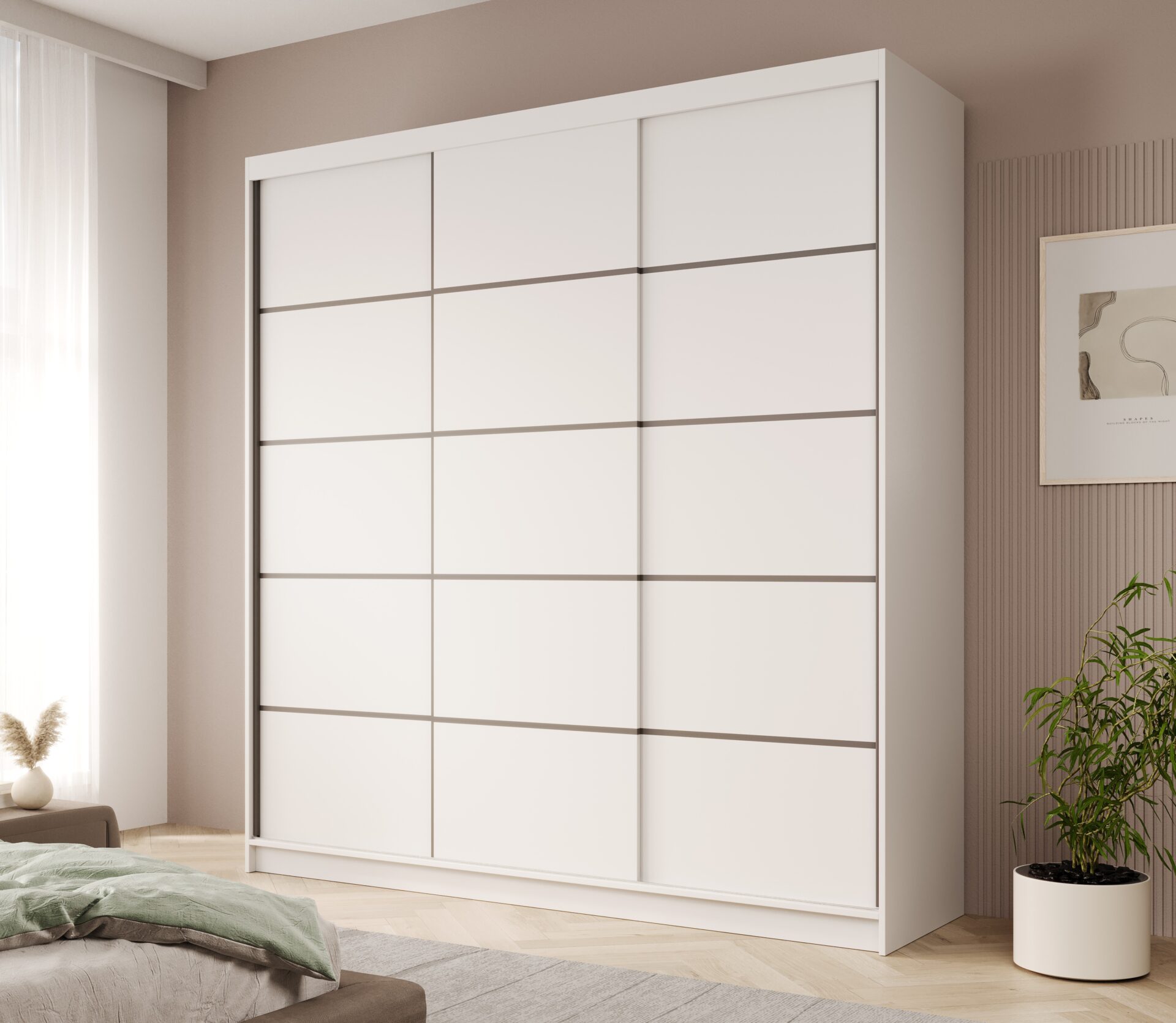 Stumdoma spinta „Greta 200“ – tai modernus ir funkcionalus sprendimas, puikiai papildantis bet kurį miegamąjį, rūbinę ar prieškambarį. Minimalistinė forma, geometriniai fasado padaliniai ir kruopšti apdaila suteikia interjerui elegantišką ir nesenstantį charakterį. Pagaminta iš aukštos kokybės 16 mm laminuotos plokštės, ji yra atspari įbrėžimams, drėgmei ir UV spinduliams, todėl užtikrina patvarumą ir estetiką ilgus metus. Spinta turi stumdomų durų sistemą, kuri leidžia lengvai atidaryti ir uždaryti duris, taupant vietą – idealus sprendimas mažesnėms erdvėms. Spintos vidus sukurtas atsižvelgiant į maksimalų funkcionalumą, jame yra lentynų ir bėgelių komplektas, leidžiantis lengvai sutvarkyti drabužius, aksesuarus ir kitus kasdienius daiktus. „Greta 200“ modelis yra penkių spalvų: klasikinės baltos, elegantiškos juodos, modernaus baltos ir juodos spalvos derinio, juodos ir baltos bei madingo kašmyro atspalvio.