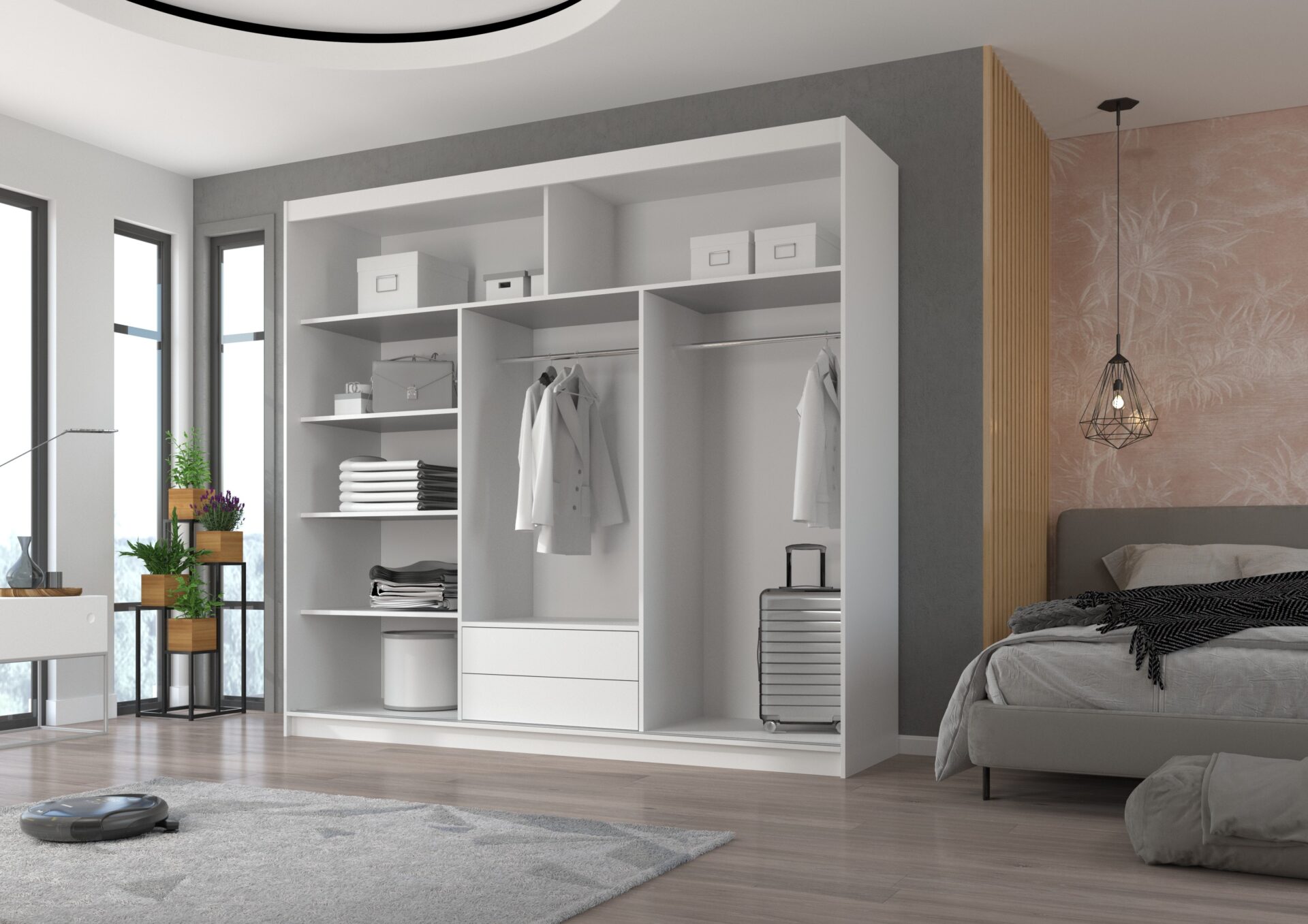 ERWIN stumdoma spinta su veidrodžiu – puikus būdas sutvarkyti erdvę. Joje yra erdvios lentynos ir pakaba suknelėms, kostiumėliams, viršutiniams drabužiams ir marškiniams. Veidrodžiai pritvirtinti priekyje, vizualiai padidindami erdvę ir suteikdami jai žavesio. Kadangi spinta yra stumdoma, nereikia kurti papildomos erdvės durims atidaryti, todėl tai puikus sprendimas mažam kambariui ar siauram koridoriui.