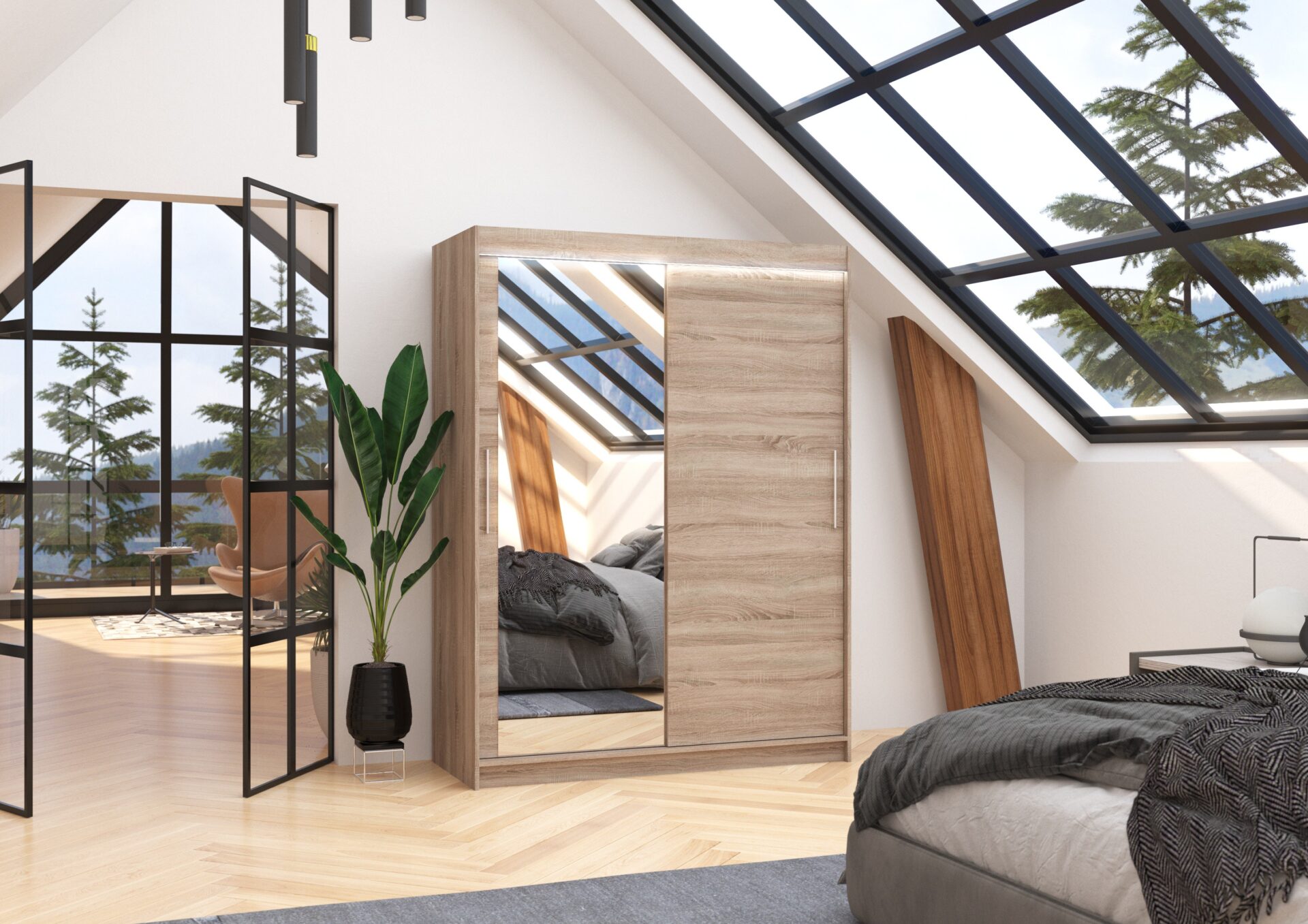 BIANCO stumdoma spinta su veidrodžiu – puikus būdas sutvarkyti erdvę. Joje yra erdvios lentynos ir pakaba suknelėms, kostiumams, viršutiniams drabužiams ar marškiniams pakabinti. Priekyje pritvirtintas veidrodis vizualiai padidina erdvę. Kadangi spinta yra stumdoma, nereikia kurti papildomos erdvės durims atidaryti, todėl tai puikus sprendimas mažam kambariui ar siauram koridoriui. Ryškus LED apšvietimas suteikia nuostabaus žavesio tiek spintai, tiek kambariui.