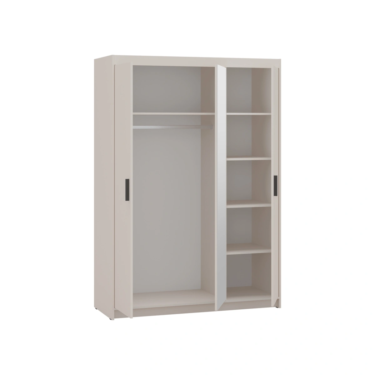 Trijų durų spinta pagaminta iš laminuotos plokštės ir turi lentyną su drabužių kabykla apačioje bei keturias lentynas centrinėje priekyje su veidrodžiu.