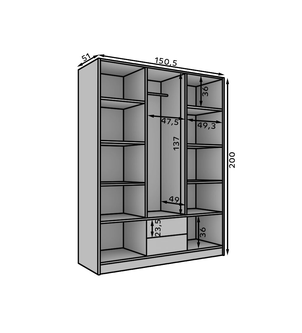 „Neri“ vyrių spinta – tai elegantiška ir funkcionali spinta, kuri puikiai papildys tiek modernų, tiek klasikinį interjerą. Dėl plataus spalvų pasirinkimo kiekvienas ras sau tinkamiausią versiją. „Neri“ spintos fasaduose yra dekoratyvinės lentjuostės ir didelis veidrodis, kuris vizualiai padidina erdvę ir suteikia jai šviesumo. Spinta siūloma trijų praktiškų dydžių: – 100 cm – kompaktiška, idealiai tinka mažesniems kambariams; – 150 cm – puikus kompromisas tarp erdvės ir dydžio; – 200 cm – erdvus variantas, idealiai tinkantis didesnei spintai laikyti. Kiekviena versija sukurta atsižvelgiant į naudojimo paprastumą ir estetiką, papuošianti bet kurį miegamąjį ar persirengimo kambarį.