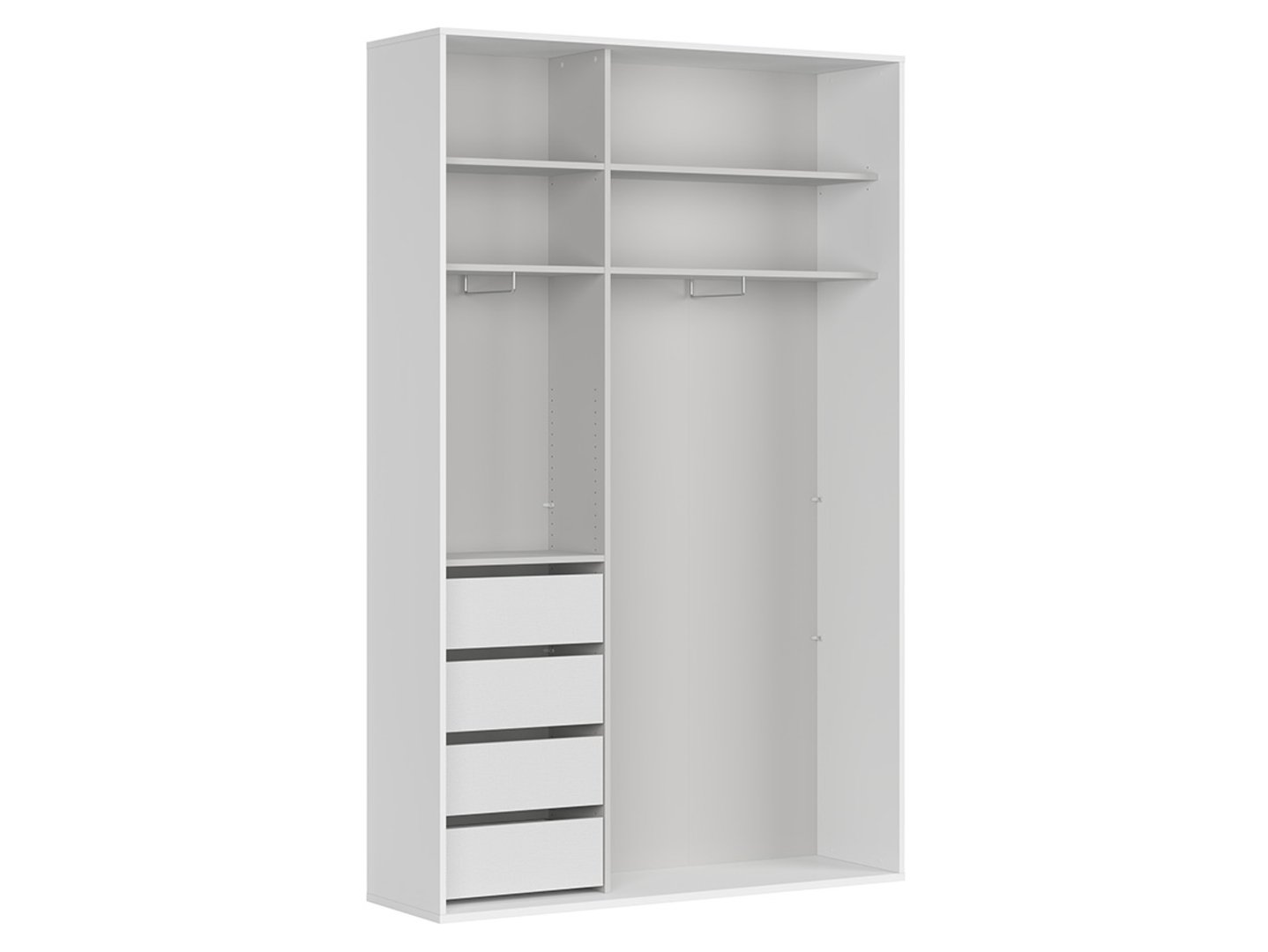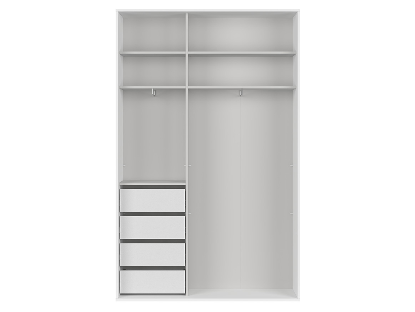 – 2 stumdomi fasadai. Stalčiai turi rutulinius guolius turinčias bėgeles, kurios leidžia juos visiškai ištraukti, o švelnaus uždarymo funkcija padidina komfortą. Stalčiai idealiai tinka apatiniams drabužiams ir aksesuarams, tokiems kaip kepurės, šalikai, skaros ir diržai, laikyti. Viršutinės lentynos, kurių plotis įvairus, gali būti naudojamos retai naudojamų drabužių krepšeliams arba sezoniniams aksesuarams laikyti. Statmenai sumontuoti drabužių skersiniai palengvina prieigą prie pakabinamų daiktų. Dėl praktiškų spintos matmenų ji taip pat idealiai tinka prieškambariui, kur idealus jos 45 cm gylis. Baltas korpusas puikiai dera su matinės baltos spalvos fasadais ir sidabrinėmis rankenomis. Spintos vidus apdailintas pilka drobe. Standartinės rutulinius guolius turinčios stalčių bėgelės užtikrina pilną ištraukimą, todėl naudojimosi patogumas yra didesnis. Papildomi stumdomų durų stabdžiai palengvina atidarymą ir uždarymą. „Flex“ spinta – organizavimas stiliumi, kuriuo visada mėgausitės.