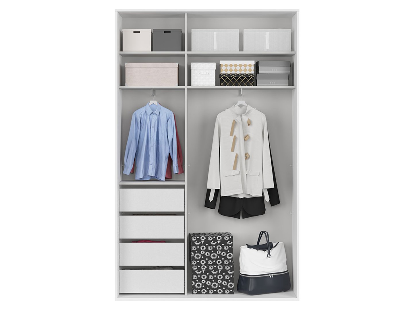 – 4 praktiški stalčiai su tvirtais fasadais, puikiai tinkantys apatiniams drabužiams ir aksesuarams,