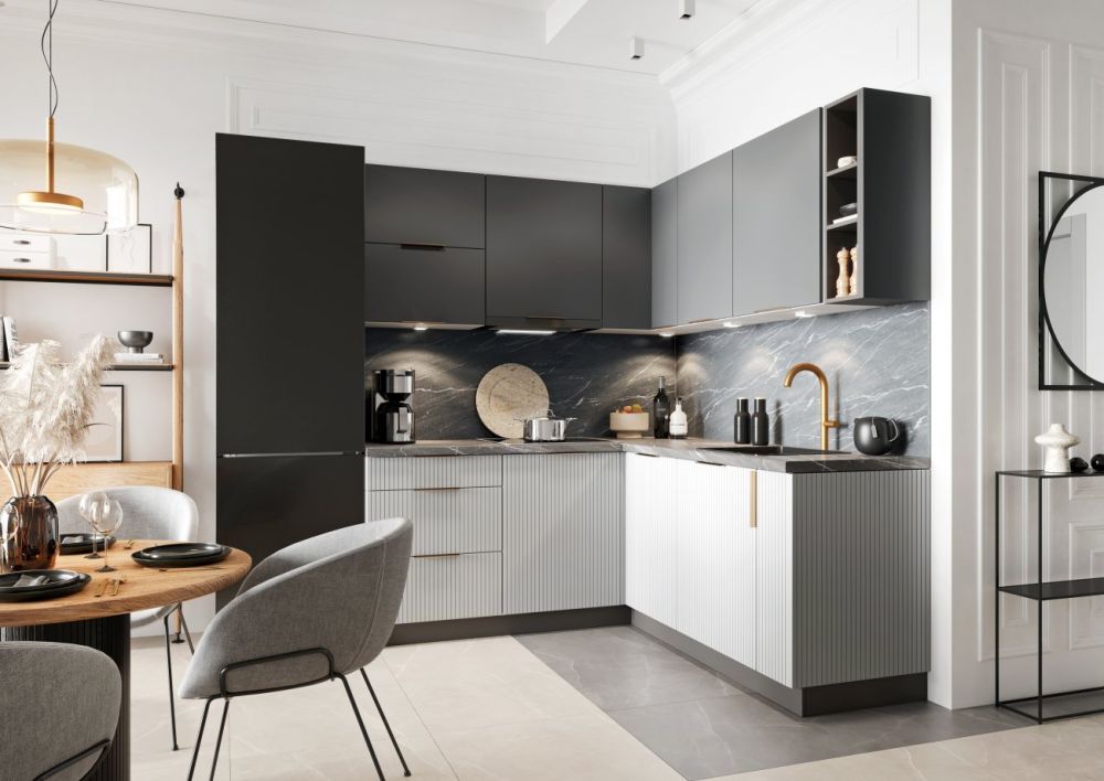 Virtuvės stilius – modernus | Fasado tipas: Laminuota plokštė / MDF / Lakuota MDF plokštė, padengta PVC folija | Matmenys: gylis be stalviršio [cm]>52,4; gylis su stalviršiu [cm]>60; plotis [cm]>90; aukštis be stalviršio [cm]>82