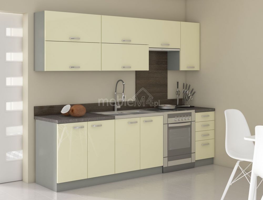 Paprastos formos, lengvas dizainas ir blizgūs PVC fasadai – tai šio komplekto privalumai. Komplektas idealiai tinka bet kuriai moderniu stiliumi dekoruotai virtuvei.
