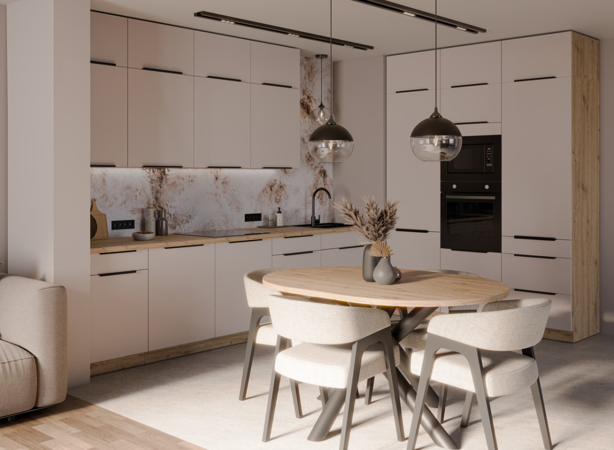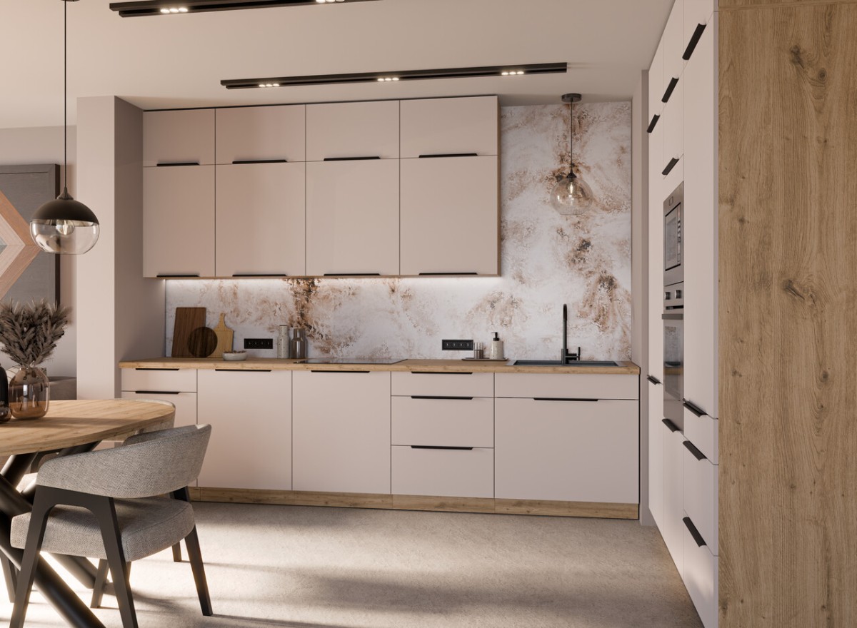 „Solea“ virtuvė – tai elegantiškas subtilaus kašmyro atspalvio ir natūralaus dirbtinio ąžuolo šilumos derinys.