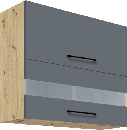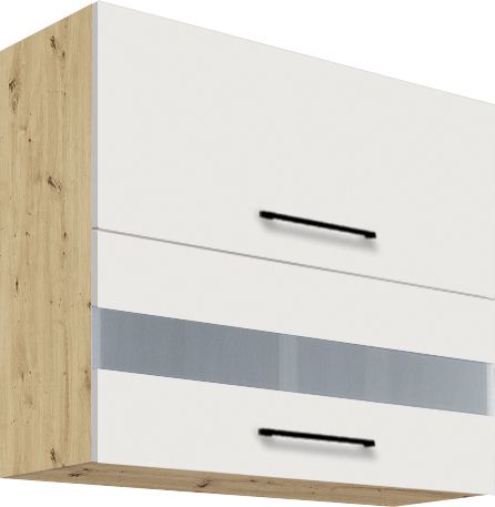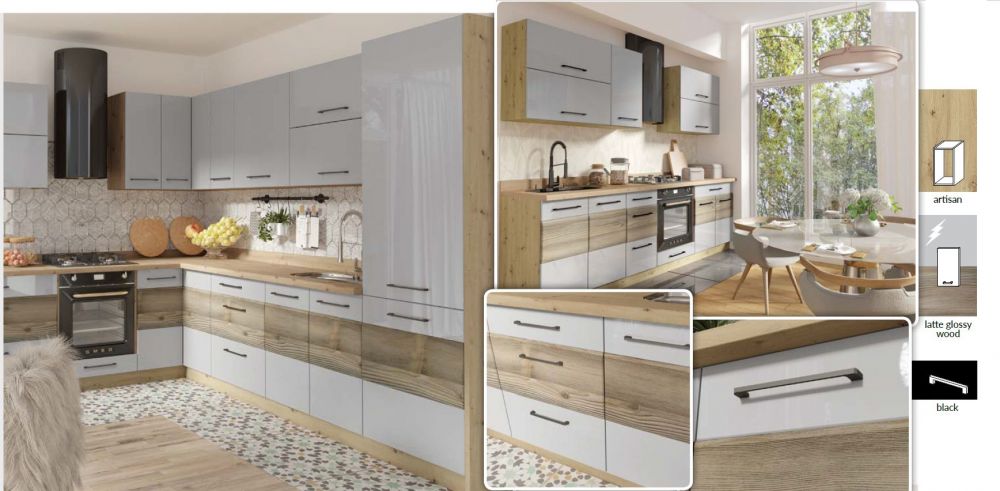 fasadai – blizgi balta + „Artisan“, blizgi latte + mediena, matinė pilka + „Artisan“ (viršutinės spintelės) (be įdėklų)