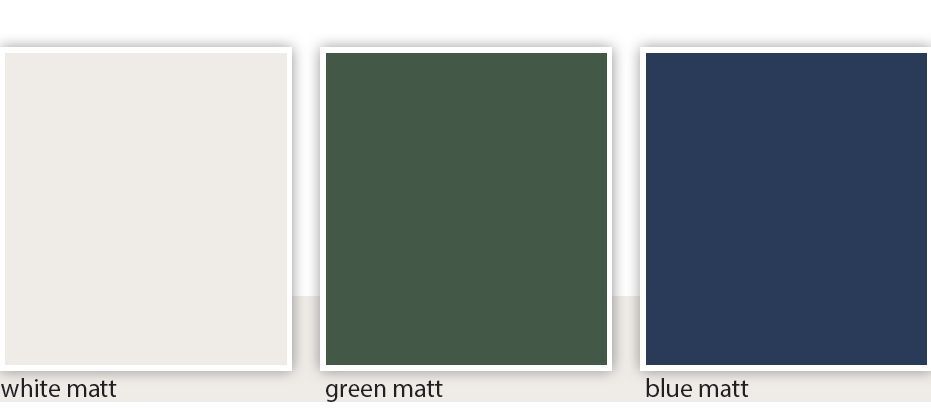 Priekinės dalys – matinė balta, matinė žalia arba matinė tamsiai mėlyna