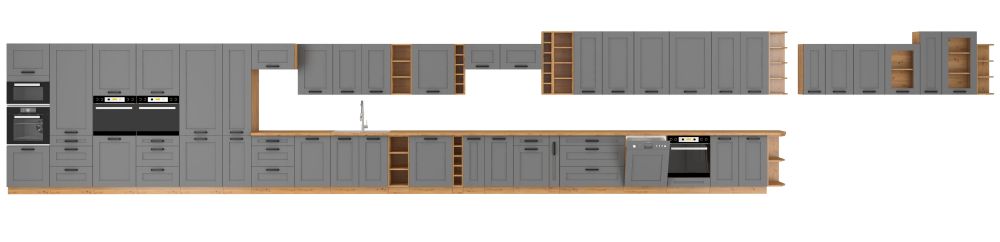 Priekinės dalys: 16 mm MDF plokštės, dulkių pilkos spalvos su frezuotu 1 mm ABS kraštu (“nešvarios” pilkos spalvos)