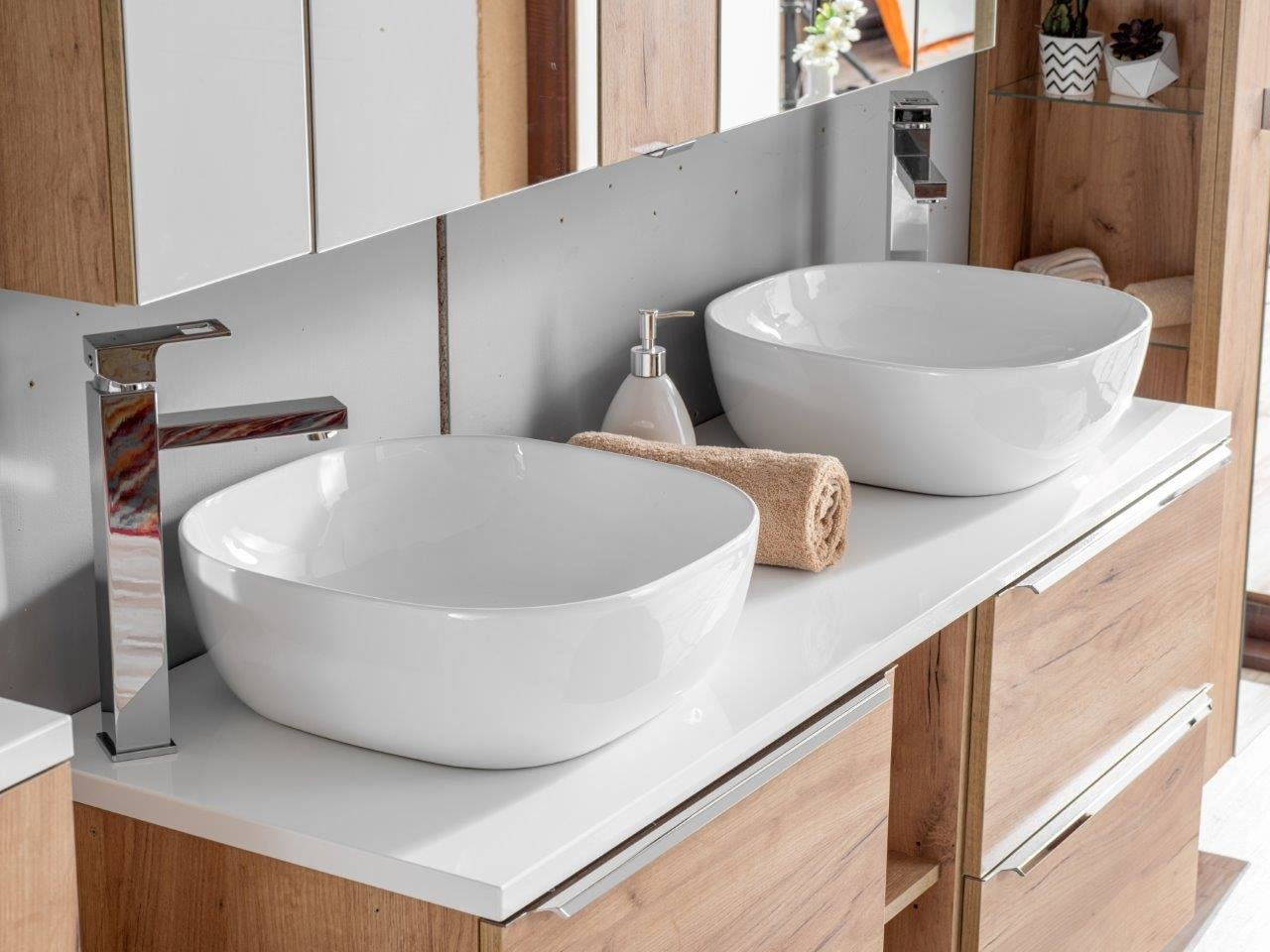 „CAPRI GOLDEN OAK“ kolekcijos unikalumas pirmiausia kyla iš paprastų, santūrių formų ir gražaus dekoro derinio, sukuriančio harmoningą ir elegantišką interjerą. Geometrinę baldų formą pabrėžia apvadais puoštos rankenėlės. Kolekcijoje siūlomas platus formų pasirinkimas, įskaitant funkcionalią spintelę su stalviršiu, suteikiančią papildomos naudingos erdvės. Patogumą didina švelniai užsidarančios stalčių bėgelės ir vyriai, užtikrinantys tylų ir švelnų uždarymą. Modernus šios kolekcijos akcentas – galimybė apšviesti stalčius praustuvų spintelėse.