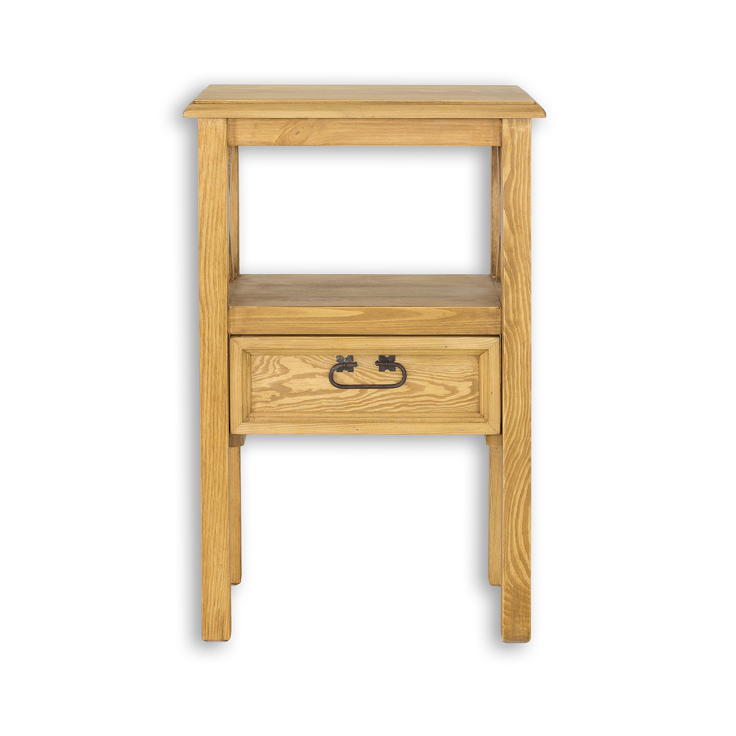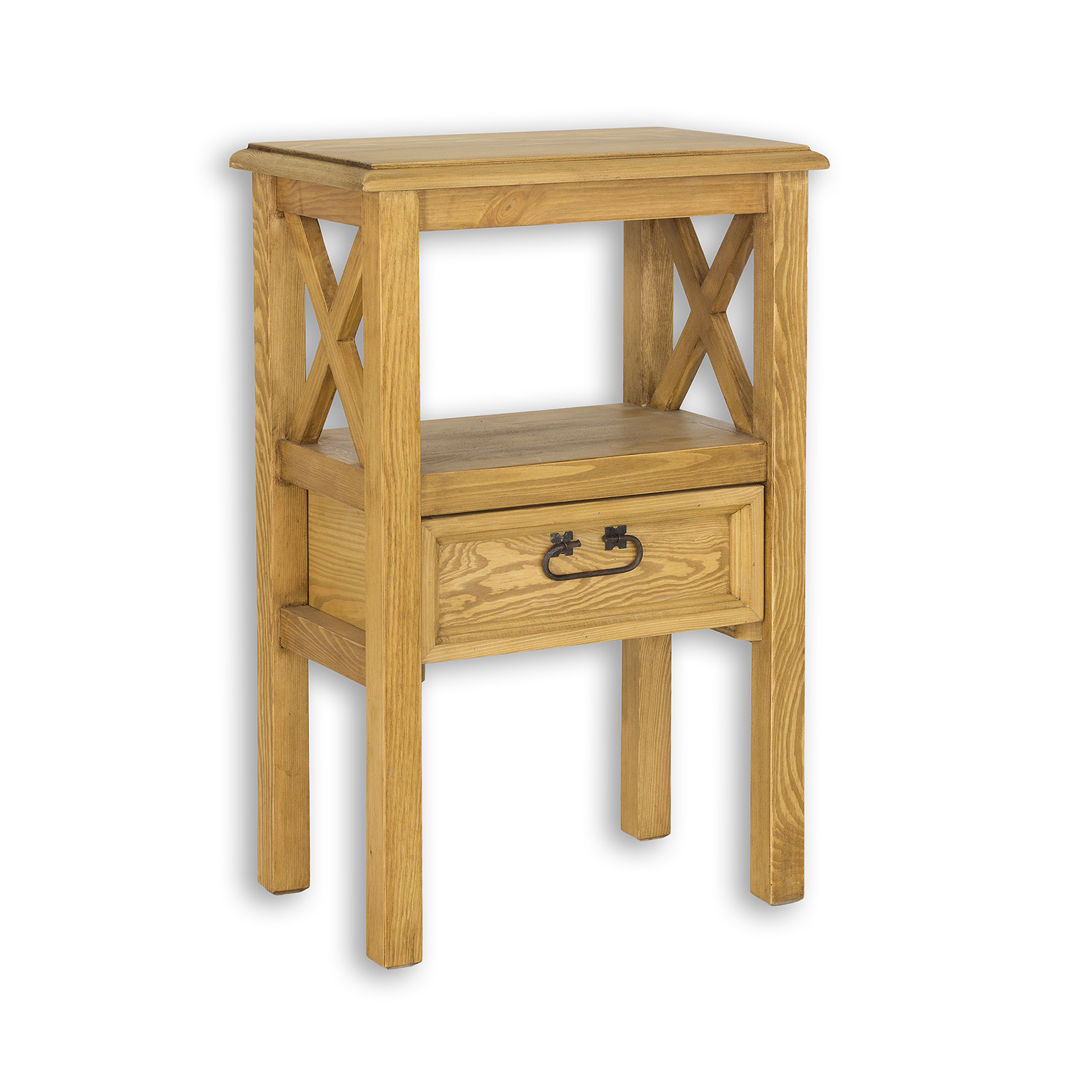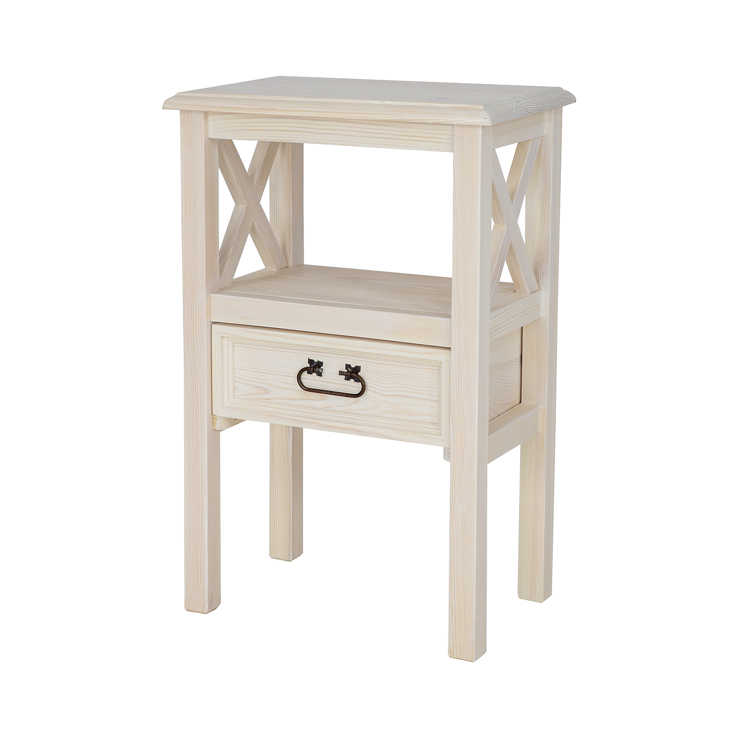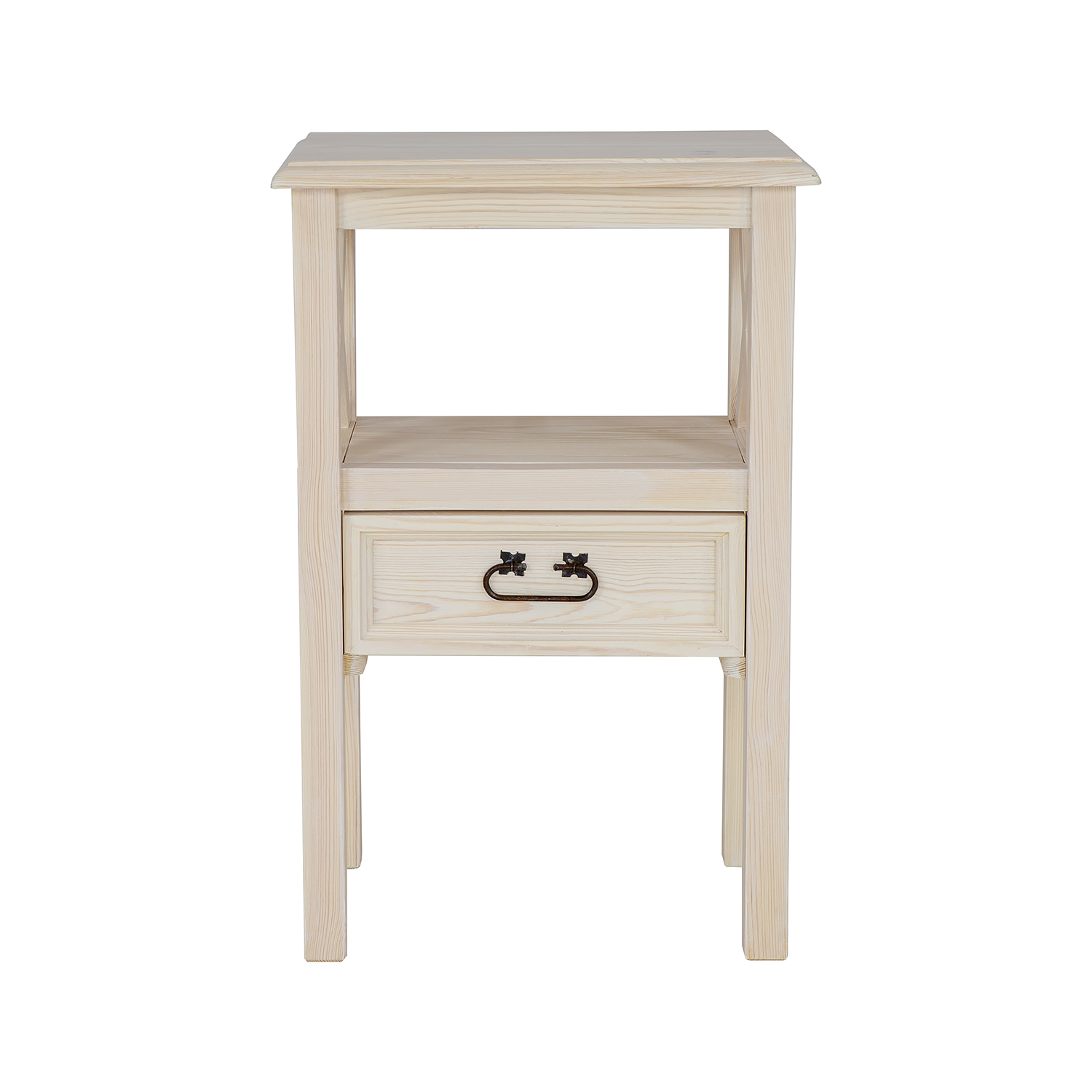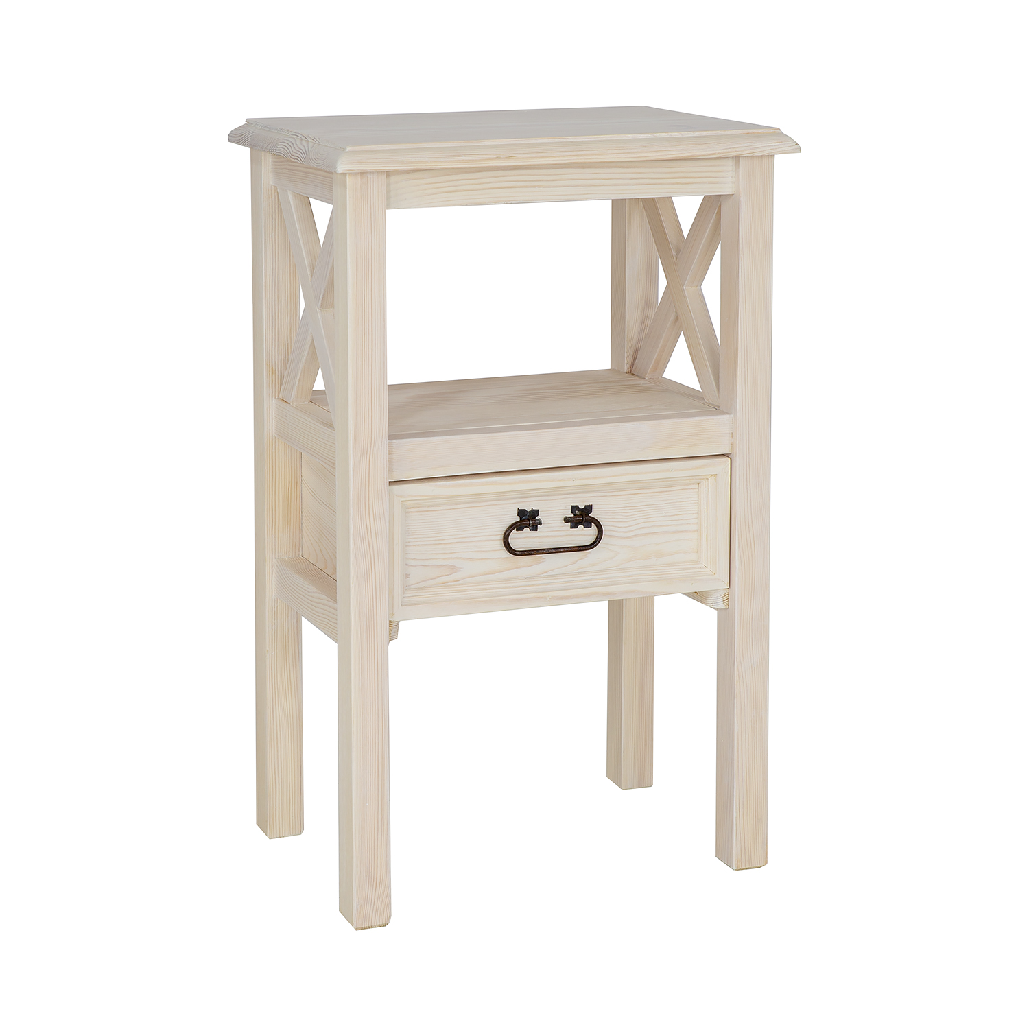 SN703 vaškuotas naktinis staliukas. Sukurtas kaimišku stiliumi, jis pagamintas vien iš tvirtos pušies medienos. Tai būtinas bet kurio stilingai dekoruoto miegamojo ir kitų erdvių elementas. SN703 taip pat gali būti naudojamas kaip šoninis staliukas arba augalų stovas. Patogus stalčius, stumdomas ant medinių bėgelių, ir atvira lentyna suteikia funkcionalią vietą daugybei smulkių daiktų. Jo konstrukcijoje panaudoti rankų darbo metaliniai vyriai ir rankenos su sendinto medžio efektu. Matomas raštas išryškina natūralios medienos grožį. SN703 suteiks unikalią atmosferą bet kokiam interjerui, kupiną šilumos ir jaukios atmosferos.