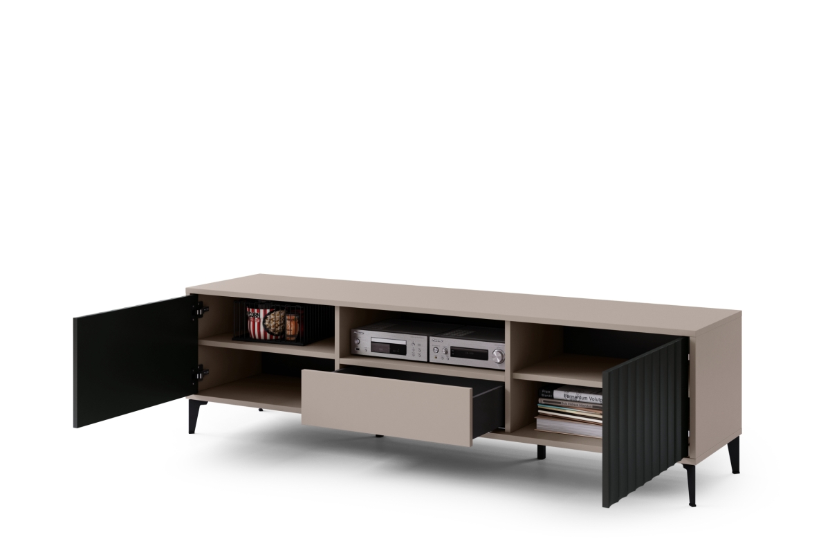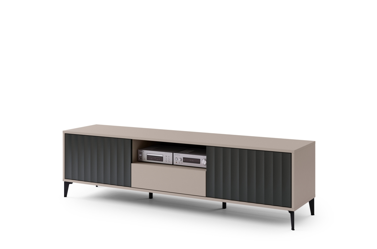RIMINI RTV-182 Smėlinė pilka/Matinė juoda – MODERNI TV SPINTELĖ SU STALČIAIS/LENTYNOMIS IR GRIOVELIUOTAIS PRIEKINIAIS