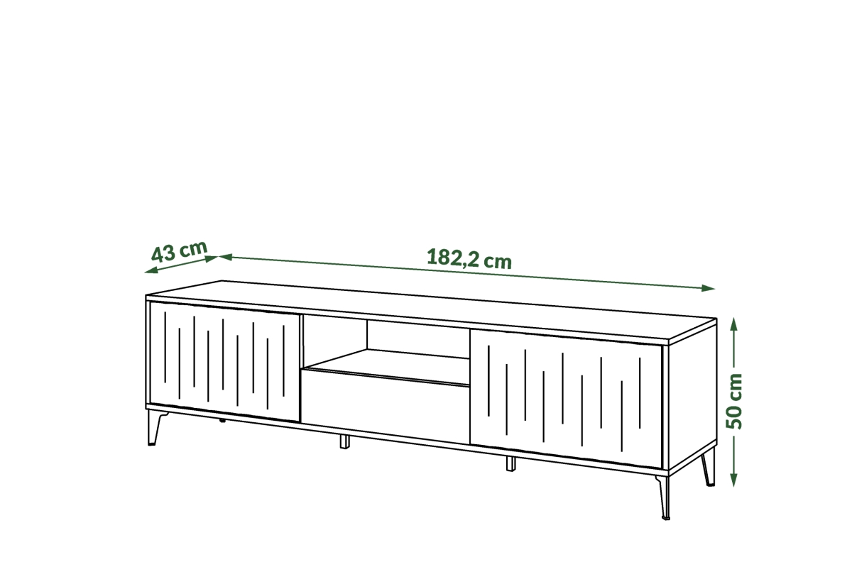 PLOTIS 182,2 cm, GYLIS 43 cm, AUKŠTIS 50 cm, MEDŽIAGOS Medžio drožlių plokštė/MDF, milteliniu būdu dažytas plienas, PAVIRŠIUS Matinis, STILIUS Modernus, SVORIS SU PAKUOTE 48,3 kg, KITA Gaminys skirtas savarankiškam surinkimui su pateiktomis instrukcijomis