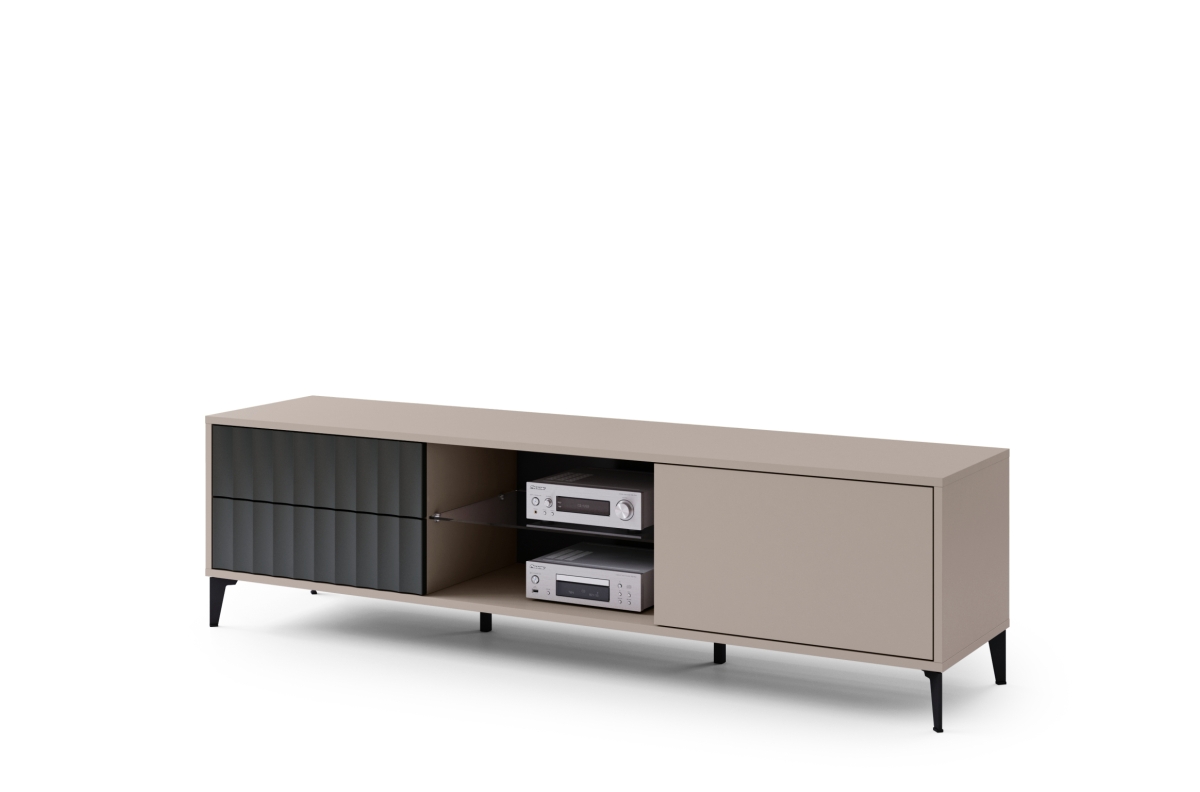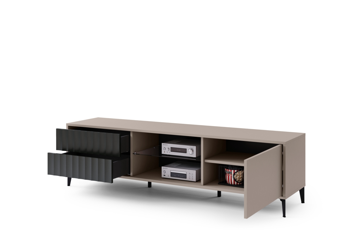 RIMINI RTV-182SK smėlio spalvos rusvai pilka/matinė juoda – MODERNI TV SPINTELĖ SU STALČIAIS/LENTYNOMIS IR GRIOVELIUOTAIS PRIEKINIAIS