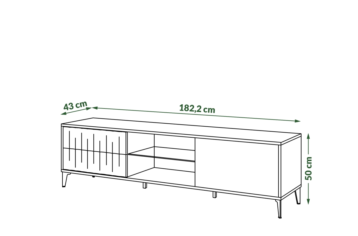 PLOTIS 182,2 cm, GYLIS 43 cm, AUKŠTIS 50 cm, MEDŽIAGOS Medžio drožlių plokštė/MDF, milteliniu būdu dažytas plienas, PAVIRŠIUS Matinis, STILIUS Modernus, SVORIS SU PAKUOTE 48,3 kg, KITA Gaminys skirtas savarankiškam surinkimui su pateiktomis instrukcijomis