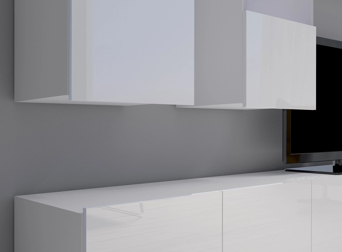 „Apulia“ televizoriaus spintelė, 100 cm, balta, blizgi, su pakabinimo galimybe, minimalistinis dizainas, paprastos formos, tinka bet kokiam interjerui