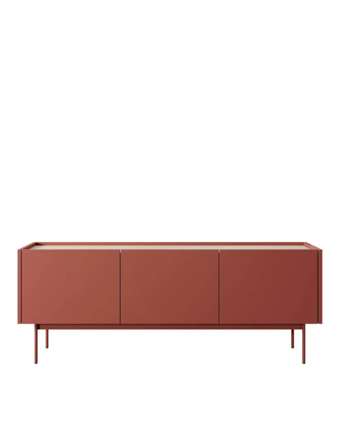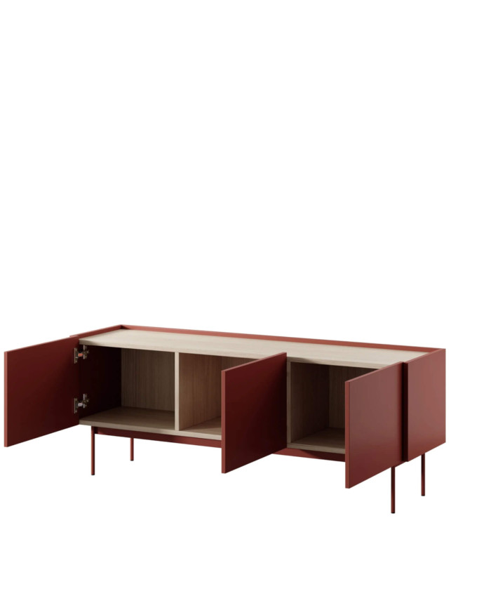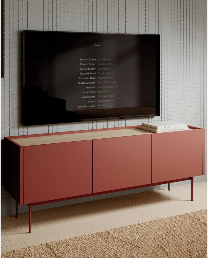Modernus „Color 144“ televizoriaus spintelė pasižymi raudonos keramikos korpusui ir priekiui bei ąžuolo viršutinei ir vidinei daliai deriniu. Spintelę sudaro trys erdvios spintelės su varstomomis durelėmis, o visas spintelė stovi ant aukštų (20 cm) metalinių kojelių, kurias lengva valyti po spintele naudojant valymo įrankius. Komplektas pagamintas iš įbrėžimams ir karščiui atsparios laminuotos ABS plokštės. Spintelę reikia surinkti, ji pristatoma plokščiai supakuota.