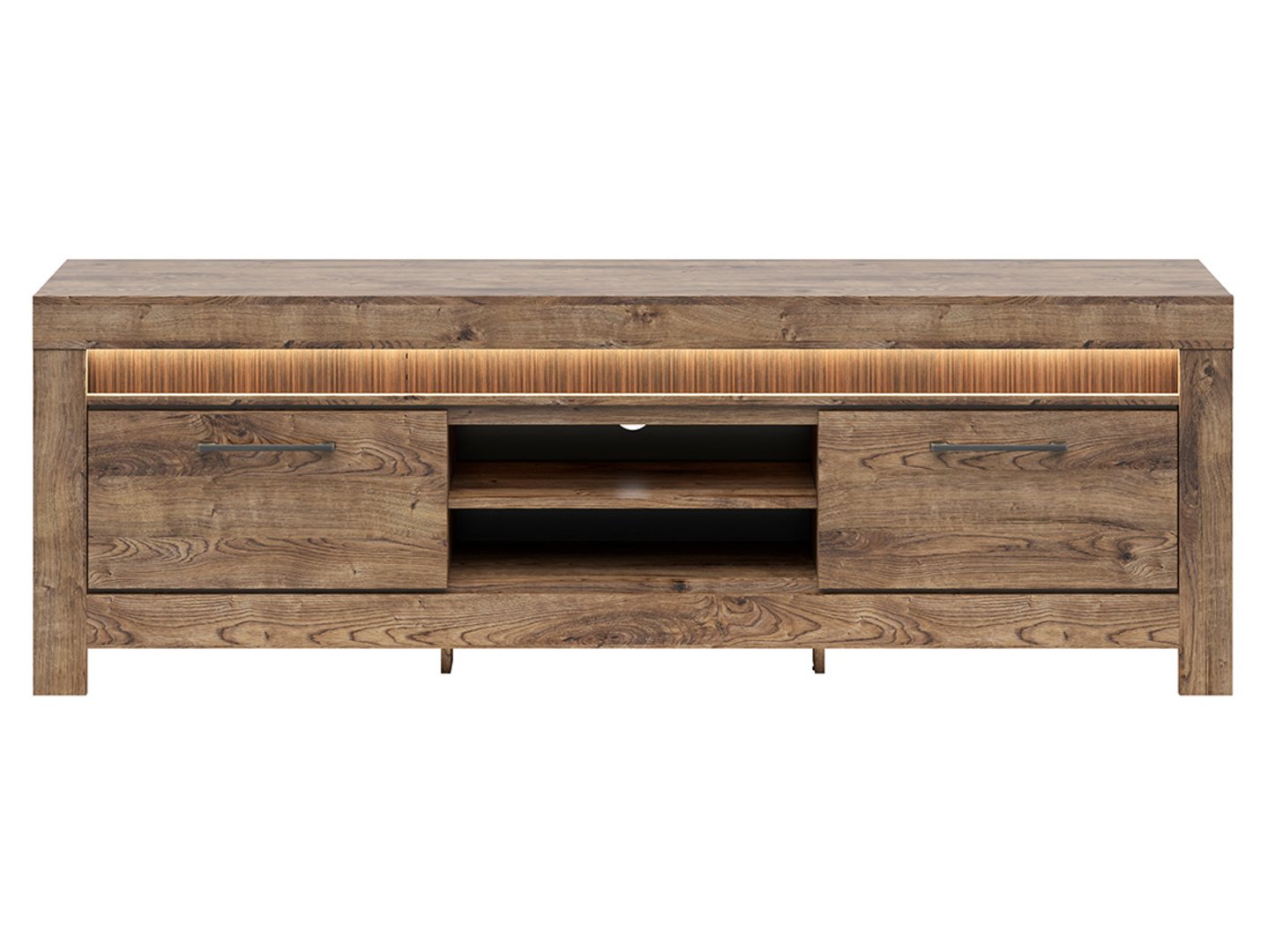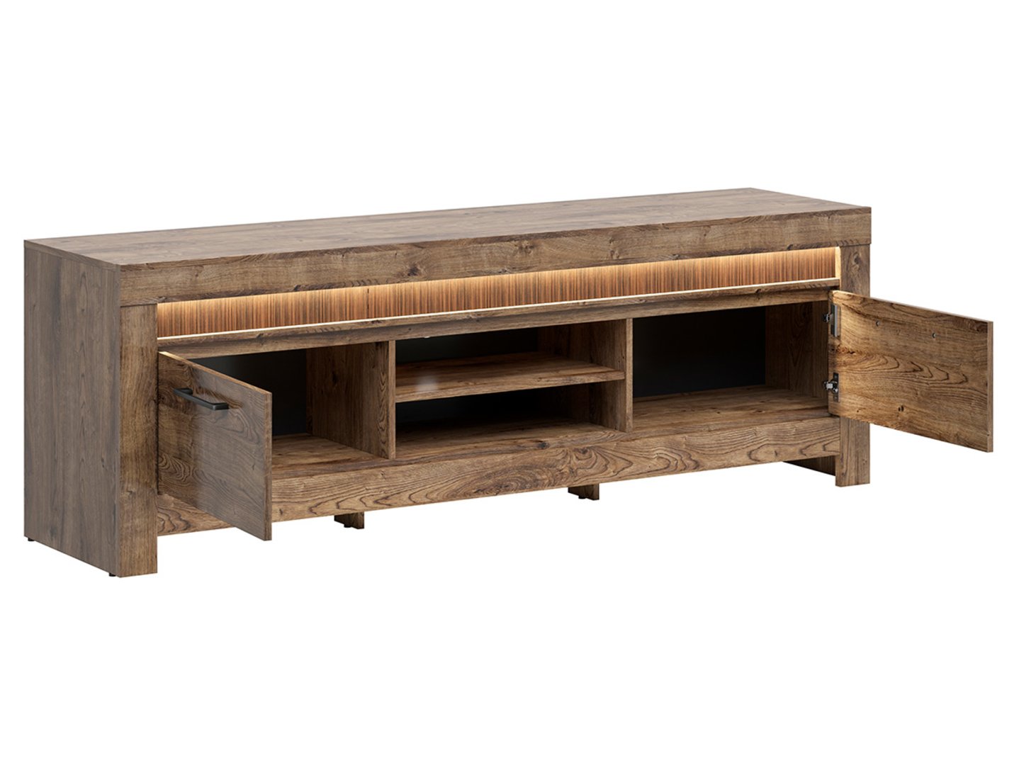 „Torin“ televizoriaus staliukas – elegancija pramogų centre. Jei ieškote kažko klasikinio, tvirto ir išraiškingo, solidaus stiliaus „Torin“ kolekcija tikrai papildys jūsų interjerą. Neįsivaizduojate svetainės be specialios pramogų ir multimedijos zonos? Rinkitės praktišką „Torin“ televizoriaus staliuką, kuris puikiai patenkins šį poreikį. Filmų maratono mėgėjams, serialų mėgėjams ir tiems, kurie mėgsta vakarus prie televizoriaus, solidus televizoriaus staliukas yra būtinas svetainėje. Platus stalviršis ne tik talpina televizorių, bet ir suteikia puikią erdvę šventinėms dekoracijoms ar kitoms dekoracijoms eksponuoti, ypač kai televizorius pakabinamas virš stovo. Šis 180 x 60 cm televizoriaus staliukas siūlo: – 2 erdvias spinteles, idealiai tinkančias laidams, įkrovikliams ar konsolių žaidimams, – 2 atviras ertmes, puikiai tinkančias elektroninei įrangai ir garsiakalbiams laikyti. Vėsi „Ribbek Brown“ ąžuolo spalva puikiai perteikia natūralų medienos rašto grožį. Solidaus stiliaus savybėms būdingi pastorinti šonai ir metalinės rankenos, taip pat nereikėtų pamiršti ir ryškios, griovelių rašto juostelės, kurios spalva – „Wenge Magic Oak“. Tinkamą apšvietimą užtikrina energiją taupantis LED apšvietimas. Televizoriaus staliuką galite derinti su kolekcijoje esančia lentyna, taip sukurdami darnų ir funkcionalų pramogų centrą. Patogų naudojimą užtikrina firminiai aksesuarai su švelnaus uždarymo mechanizmais ir metalinėmis rankenomis. Derinkite „Torin“ televizoriaus staliuką su kitais „solid“ kolekcijos elementais, kad sukurtumėte ergonomišką ir stilingą svetainės dizainą. Šią erdvę galite naudoti poilsiui, pramogoms ir susibūrimams su artimaisiais.