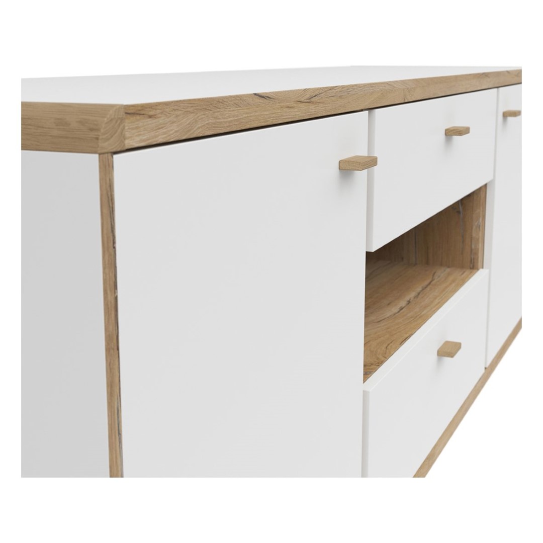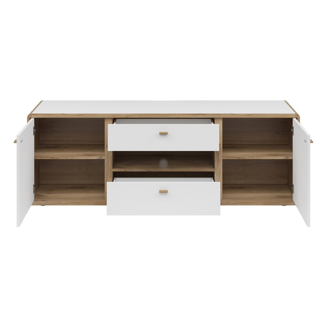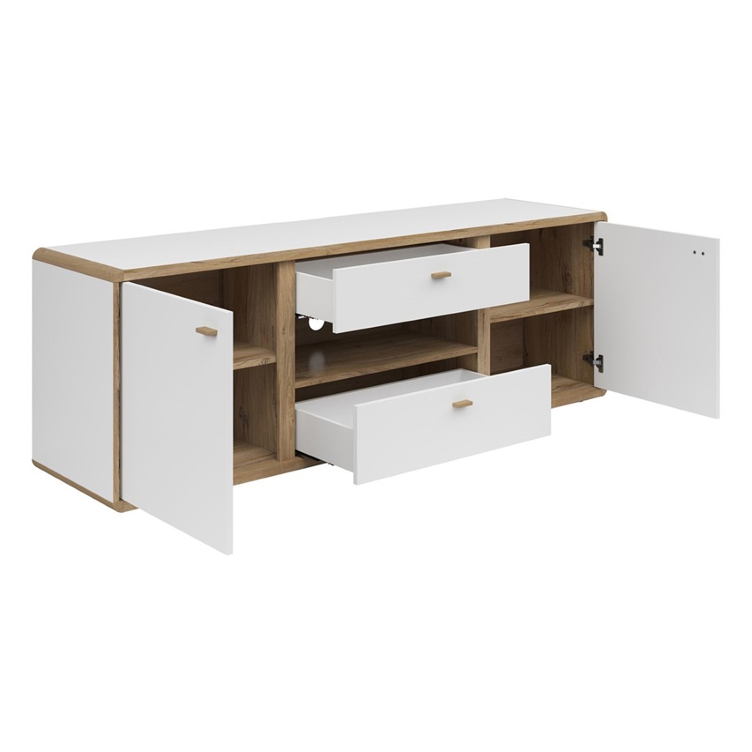 Dvidurė TV spintelė su dviem stalčiais RONDA, 178 cm, šviesaus ąžuolo vėliavėlės stiebo spalva/balta