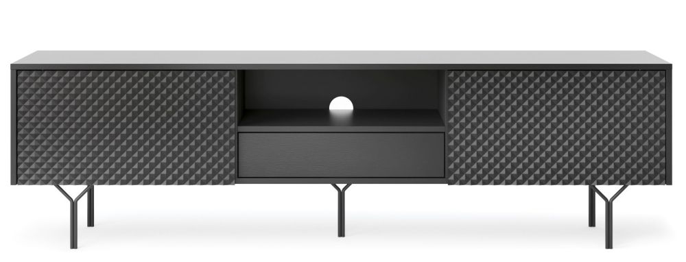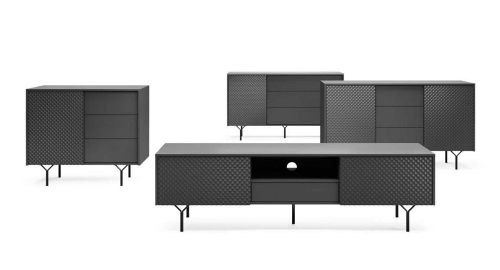 „Raven“ sudaro keturios dalys: 180 cm ilgio televizoriaus staliukas ir trys įvairių konfigūracijų komodos. Jos sumontuotos ant plieninių kojelių, todėl, nepaisant juodos spalvos, atrodo lengvos.