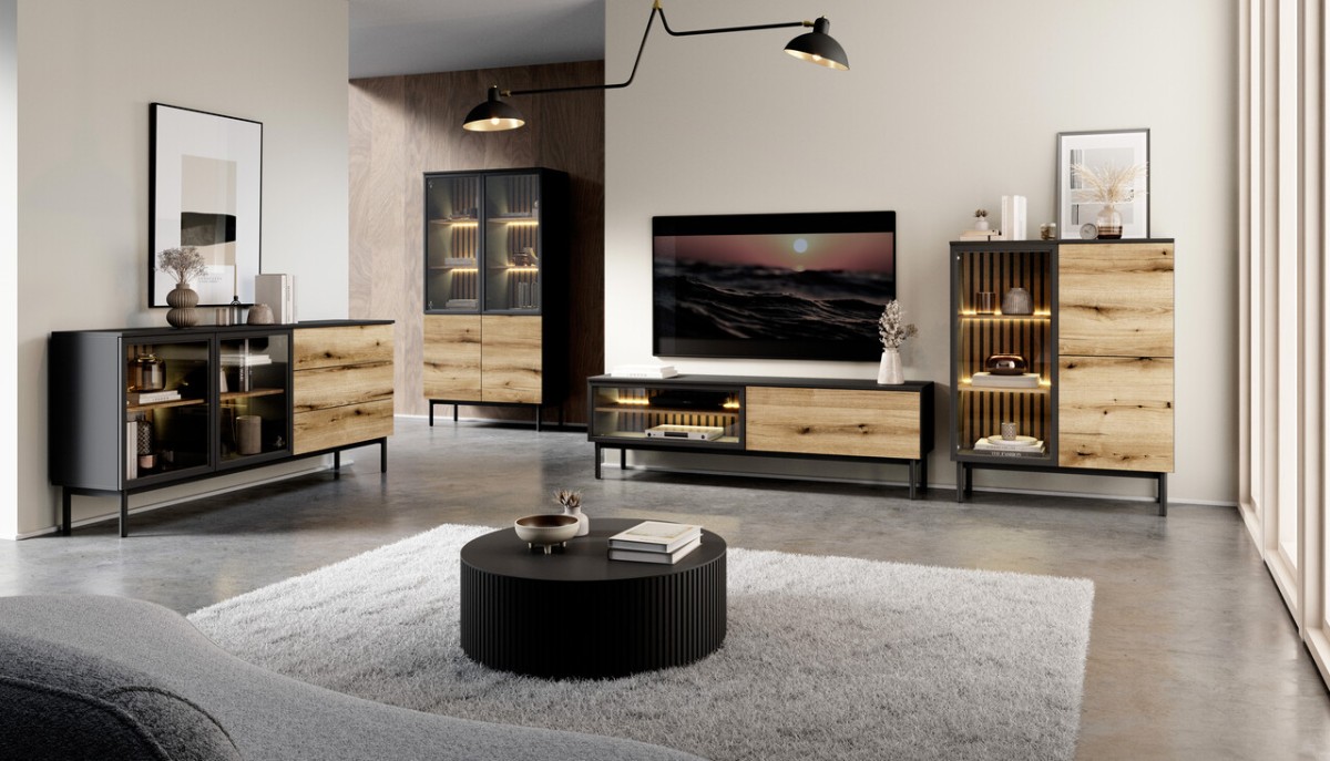 Lofto stiliaus televizoriaus spintelė su stikliniu priekiu ir „Lang 180“ apšvietimu