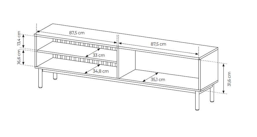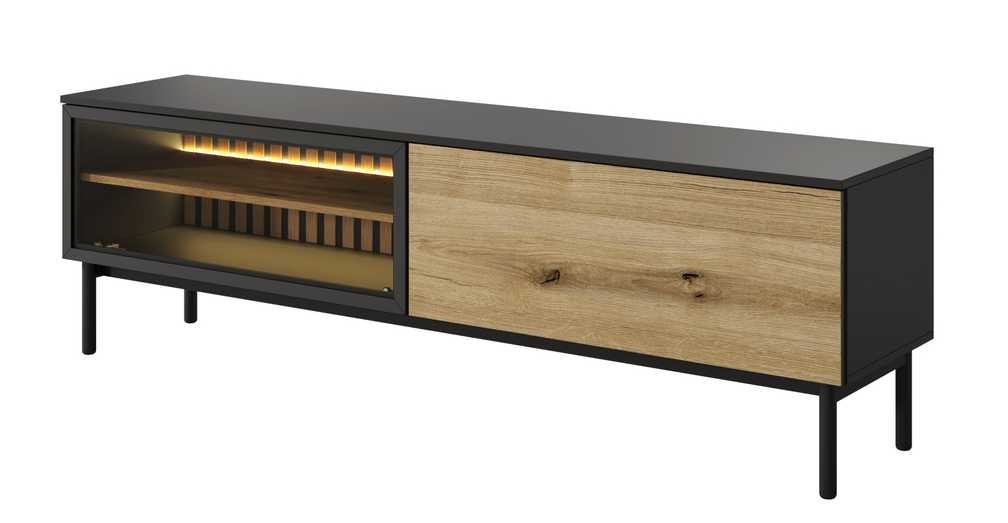 „Lang“ televizoriaus staliukas – su dviem atidaromais fasadais, grotelių fonu ir apšvietimu.