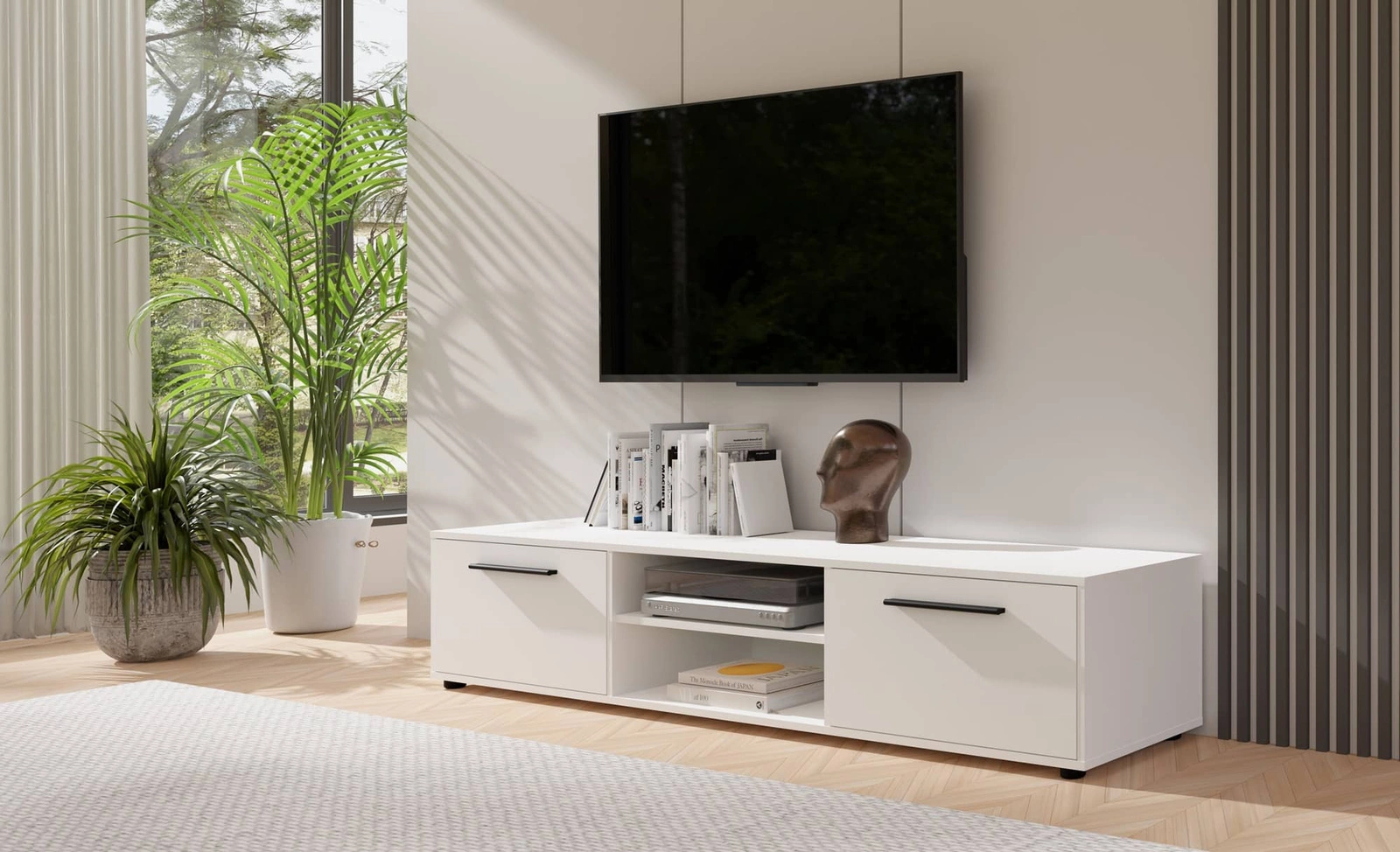Baltas 190 cm pločio „Maxione“ televizoriaus staliukas puikiai tiks bet kurioje svetainėje ar darbo kambaryje.
