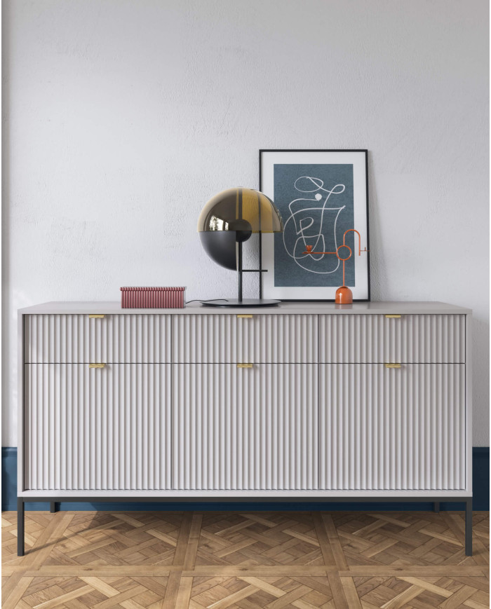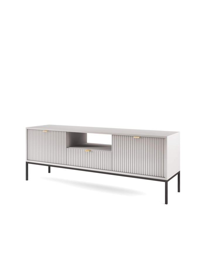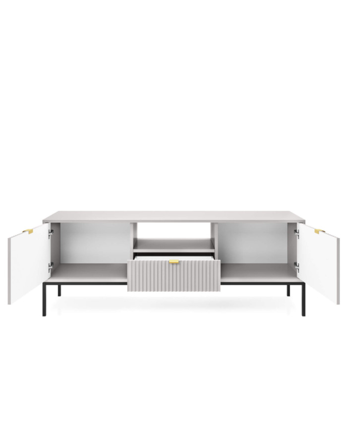 Modernus ir dizainerio sukurtas „Nova RTV154“ televizoriaus staliukas su grioveliais iš MDF plokštės fasadais turi dvejas varstomas duris, įgilintą įrangos skyrių su kabelio išvadu ir praktišką stalčių. Aukso spalvos metalinė rankena pabrėžia elegantišką dizainą. Apačioje yra juodas metalinis rėmas su aukštomis (20 cm) kojelėmis. Televizoriaus staliukas pagamintas iš įbrėžimams atsparios pilkos laminuotos plokštės ir pristatomas išardytas su lengvai suprantamomis instrukcijomis. Spintelę taip pat galima įsigyti su auksiniu pagrindu ir kojelėmis.