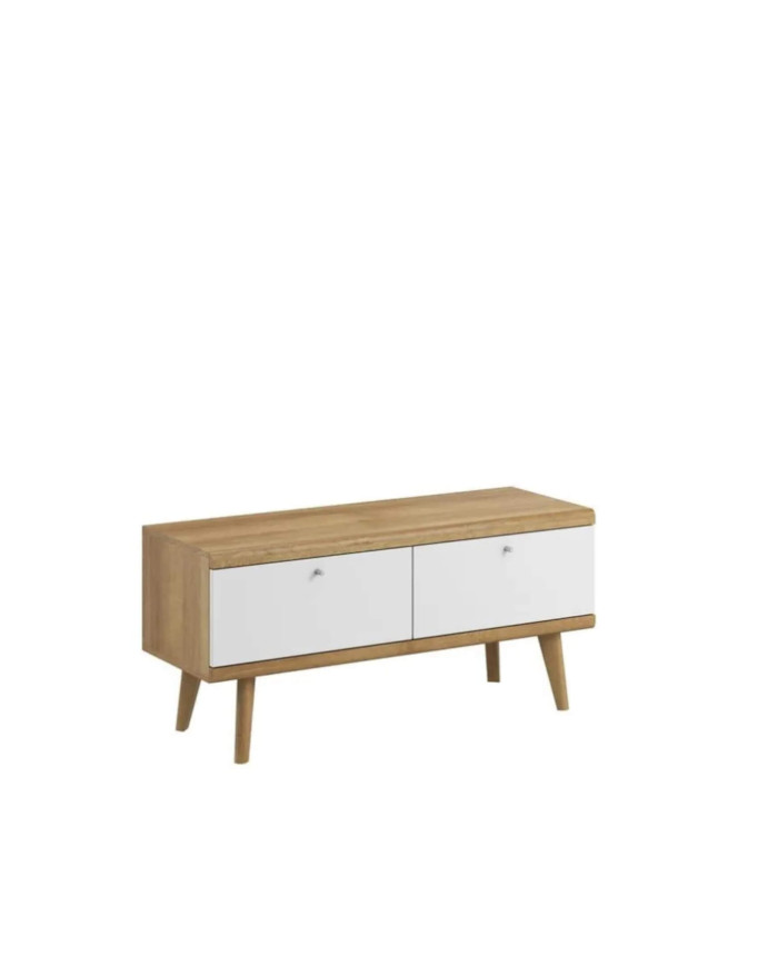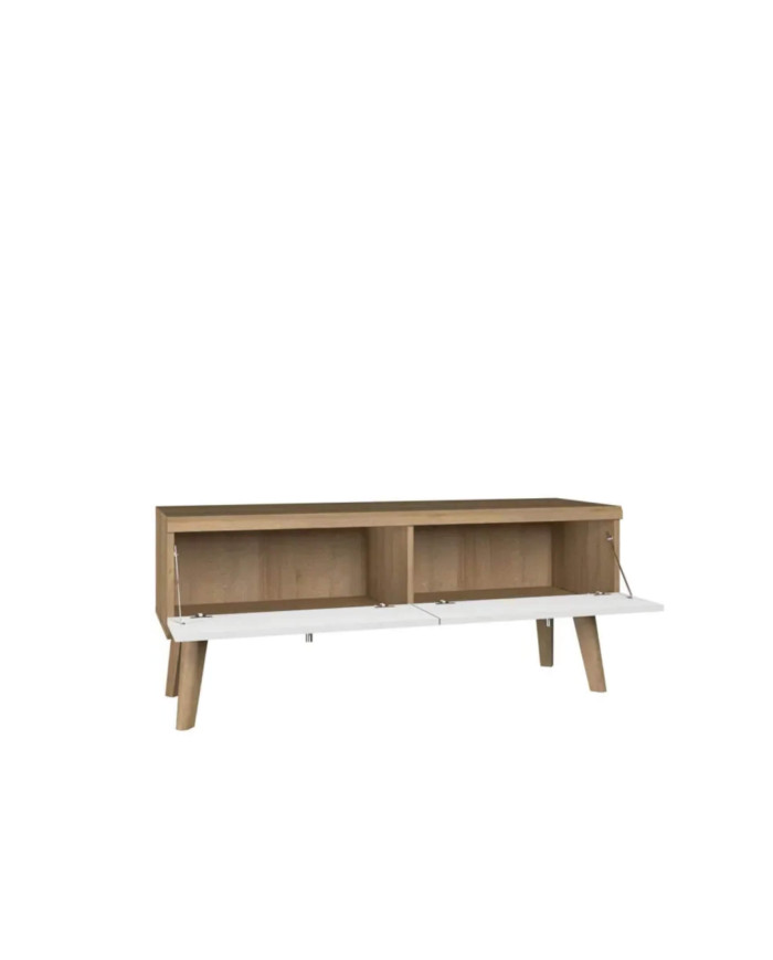 „Prima“ televizoriaus staliukas turi du erdvius skyrius su atlenkiamais atvartais. Apatinėje dalyje yra aukštos (20 cm) medinės kojelės, pabrėžiančios skandinavišką stovo charakterį. Komplektą puošia dekoratyvinės juostelės, pagamintos iš patvarios MDF plokštės, o korpusas – iš įbrėžimams atsparios laminuotos baldų plokštės. Televizoriaus staliukas priklauso to paties pavadinimo baldų linijai ir pristatomas supakuotas.
