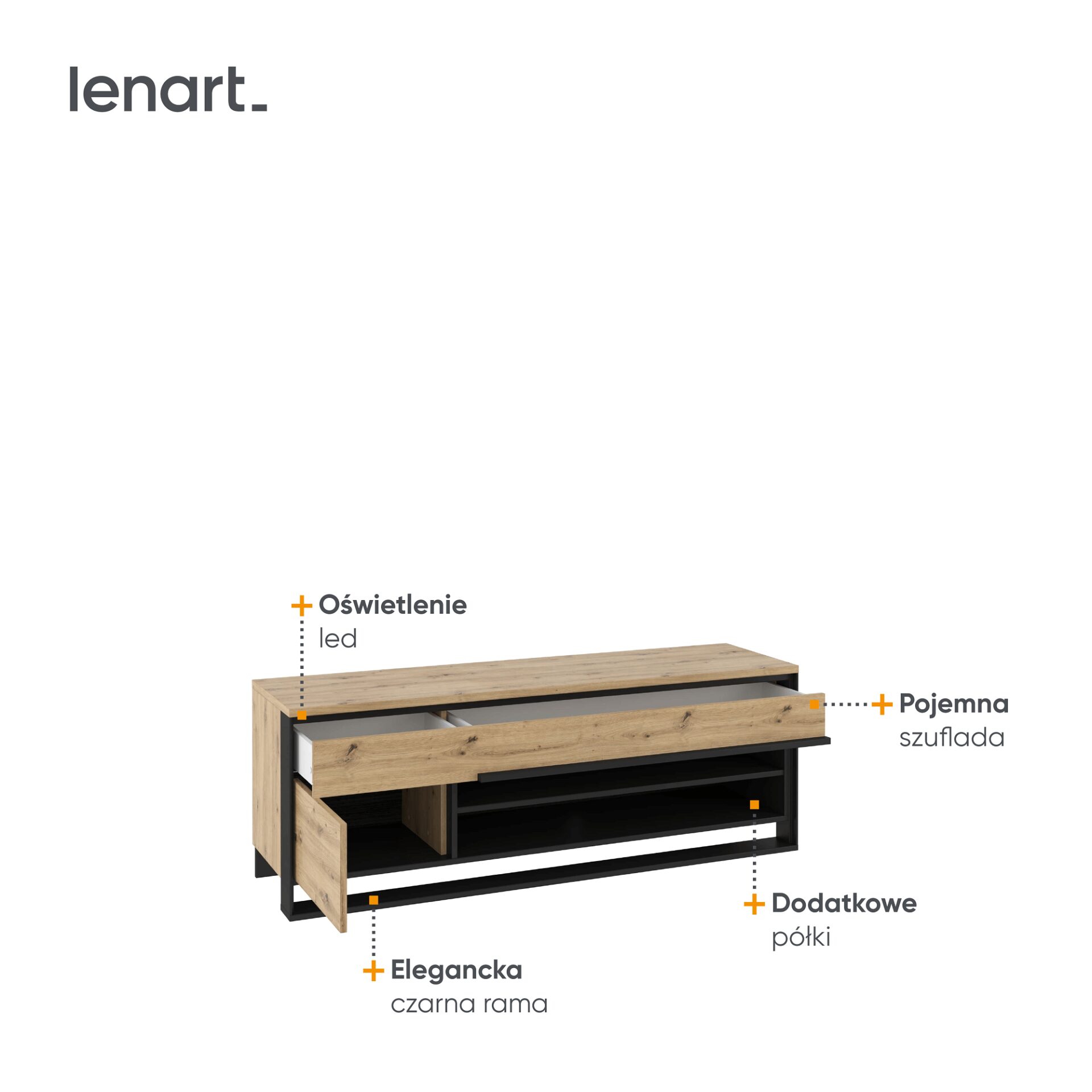 Modelis: QA-04 Spalva: artisan ąžuolas / juoda Matmenys: Plotis: 155 cm Aukštis: 55 cm Gylis: 41 cm Pagrindinė informacija: korpuso pavadinimas: QA-04 kolekcijos pavadinimas: QUANT korpuso indeksas: QA4DAC spalvos: artisan ąžuolas / juoda baldų tipas: TV spintelė korpuso charakteristikos: 1D1S plotis: 155 cm aukštis: 55 cm gylis: 41 cm korpuso svoris: 41 kg surinkimas: reikalingas surinkimas kolekcijos stilius: modernus interjeras 1 tipas: svetainė įranga: 1x lentyna stalčių skaičius: 1 durelių skaičius: 1 furnitūra: vyris: standartinis paslėptas stalčius bėgelis: tvirtinamas apačioje bėgelis pėda / koja: slysta su vinimis įtrauktas apšvietimas: yra apšvietimo tipas: LED juostelė Medžiaga: korpusas: laminuota medžio drožlių plokštė: 16 mm; 22 mm korpuso krašto apdaila: A 0,45 mm korpuso spalva: juoda / artisan ąžuolas viršus: laminuota medžio drožlių plokštė; 22 mm viršutinės krašto apdaila: A 0,45 mm klijuotų viršutinių kraštų skaičius: 4 viršutinės spalvos: artisan ąžuolas galinė sienelė: HDF plokštė; 3 mm storio matomos galinės sienelės dalies apdaila: laminatas; nematomos galinės sienelės dalies apdaila: neapdorota; galinės sienos tvirtinimas: „Nuta“; galinės sienelės spalva: juoda; lentyna: laminuota medžio drožlių plokštė; 16 mm; lentynos krašto apdaila: A 0,45 mm; klijuotų lentynų kraštų skaičius: 1; leistina lentynos apkrova: 5 kg; lentynos spalva: meniškas ąžuolas; lentynų skaičius: 1; priekis: MDF plokštė; 16 mm; priekinės dalies spalva: meniškas ąžuolas; stalčiaus vidinė apdaila: balta juostelė; stalčiaus dugnas: HDF plokštė; 3 mm. Svarbu: Spintelė gaminama pagal individualų kliento užsakymą. Užsakymo atšaukti negalima praėjus 48 valandoms nuo pateikimo. Prašome apsipirkti atidžiai.