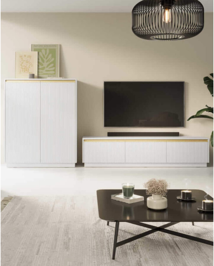 Baltas „Royal RTV 180“ televizoriaus staliukas žavi savo patraukliu dizainu. Jo modernų charakterį pabrėžia grioveliais iš patvarios MDF plokštės pagaminta priekinė dalis ir elegantiški auksiniai akcentai. Dėl santūraus stiliaus jis puikiai tinka tiek moderniam, tiek klasikiniam interjerui. Auksiniai dekoratyviniai elementai pabrėžia prestižinį baldų ryšį su prabangiu stiliumi. „Royal“ televizoriaus staliukas turi tris švelniai užsidarančias varstomas dureles ir pristatomas supakuotas. Jis yra to paties pavadinimo baldų komplekto dalis, leidžianti sukurti darnius išdėstymus.