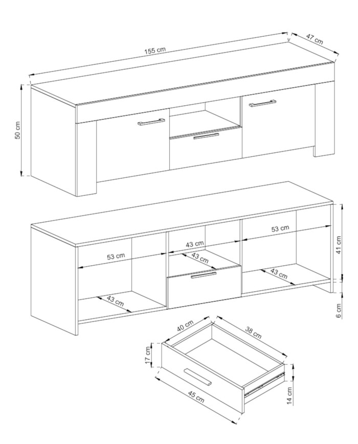 „Sky SRTV 155“ televizoriaus staliukas su pakabinama lentyna (P155) turi dvejas varstomas duris, daiktadėžę ir supakuotą stalčių. Viršutinėje komplekto dalyje yra pakabinama lentyna smulkiems daiktams ir šeimos relikvijoms laikyti. Spintelė pagaminta iš įbrėžimams atsparios laminuotos plokštės ir pristatoma plokščiai supakuota.
