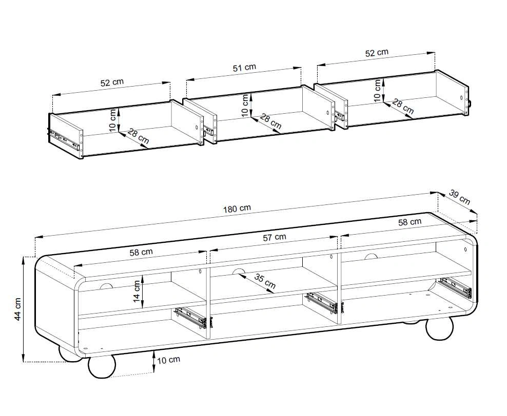 Albion RTV180 spintelė – turi tris stalčius ir nišas.