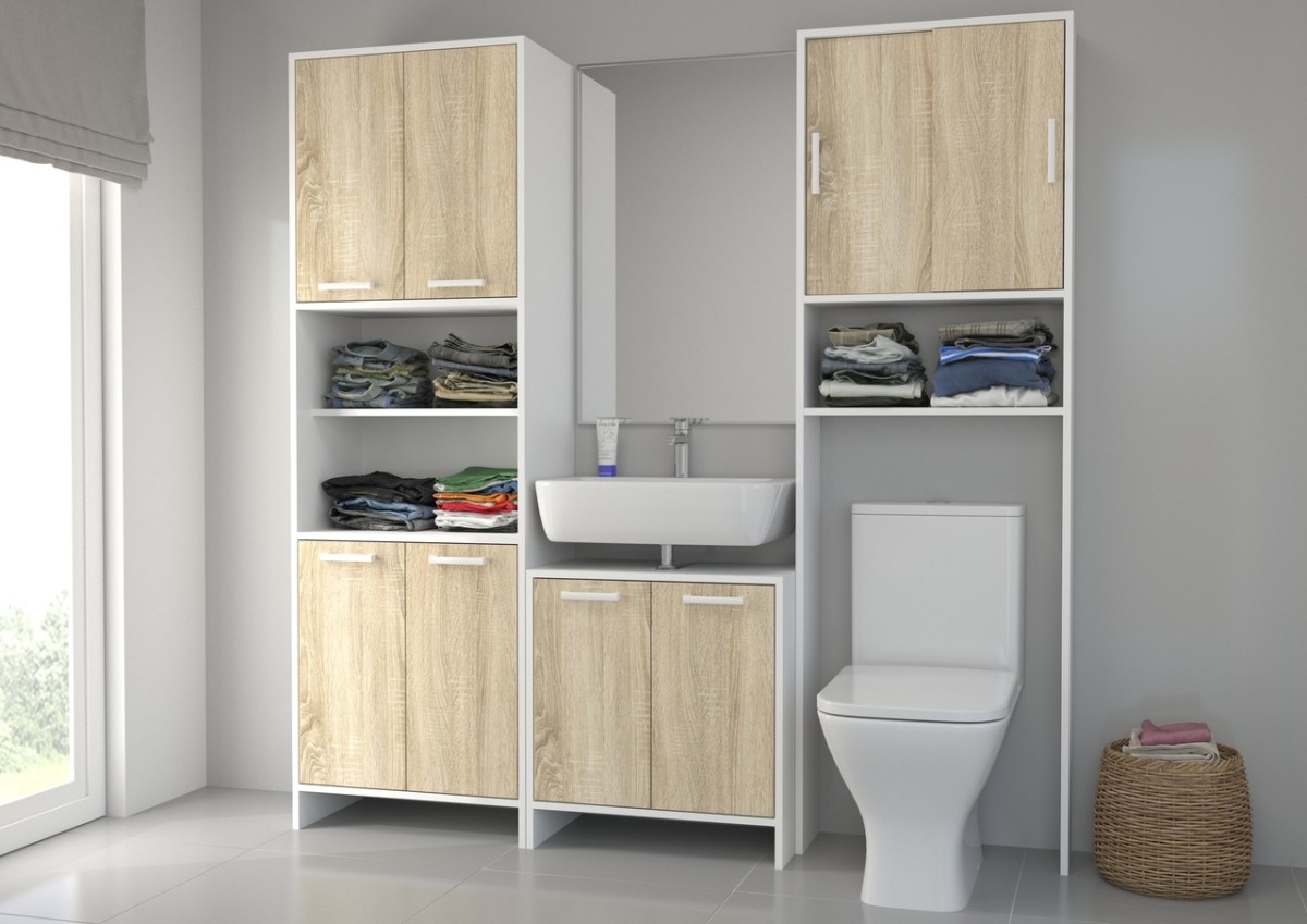 Sonoma ąžuolo ir baltos medienos derinys neužgožia erdvės, priešingai – suteikia vonios kambariui daug šilumos. Subtilios rankenėlės ir minimalistinis dizainas leidžia MELA vonios kambario komplektui puikiai derėti prie daugelio interjerų.