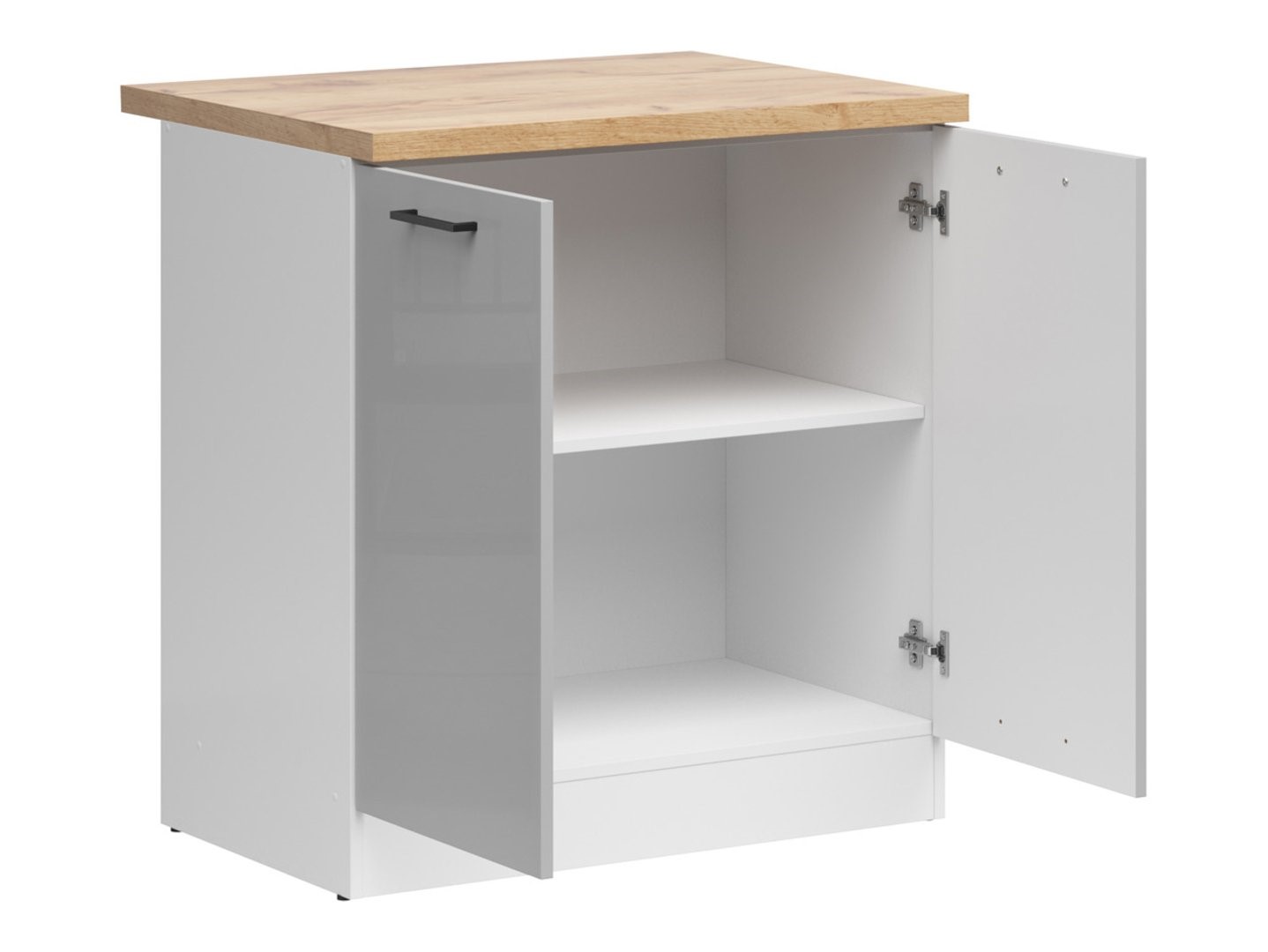 Įmontuojama spintelė su stalviršiu užima 80 × 60 cm plotą ir, dėka dvigubų durelių, atsidaro į abi puses. Spintelė pasižymi minimalistiniu dizainu, baltu korpusu ir lygiais, šviesiai pilkais blizgiais fasadais. Kontrastingas auksinio atspalvio ąžuolo stalviršis suteikia elegancijos. Be to, spintelė turi nesenstančią juodą rankenėlę, kuri ne tik palengvina atidarymą, bet ir suteikia charakterio. Kitus „Junona Line“ kolekcijos elementus ir aksesuarus galite įsigyti svetainėje emkameble.pl. Moduliniai virtuvės baldai – sprendimas ne tik mažoms, bet ir didesnėms virtuvėms. Derinkite apatinę spintelę su kitais „Junona Line“ kolekcijos elementais ir sukurkite savo poreikiams pritaikytą komplektą.