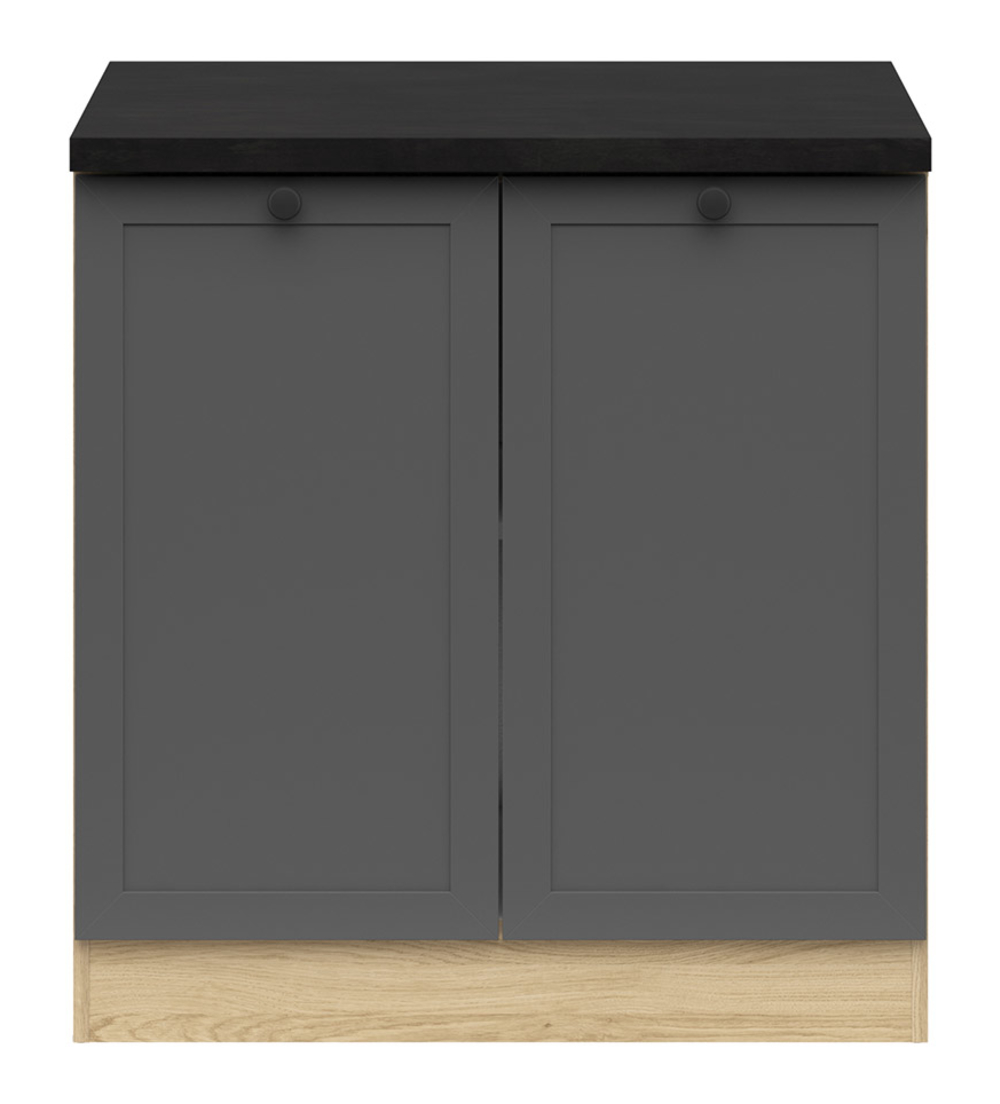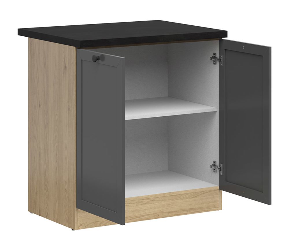 Apatinėje spintelėje yra praktiška lentyna, kuri padalija vidų į dvi dalis, todėl virtuvės reikmenis lengva susidėti pagal naudotojo poreikius. Optimalūs 80 × 86 cm matmenys leidžia puikiai tinka net mažoms virtuvėms, efektyviai išnaudojant erdvę šalia orkaitės, kriauklės ir šiukšliadėžės.