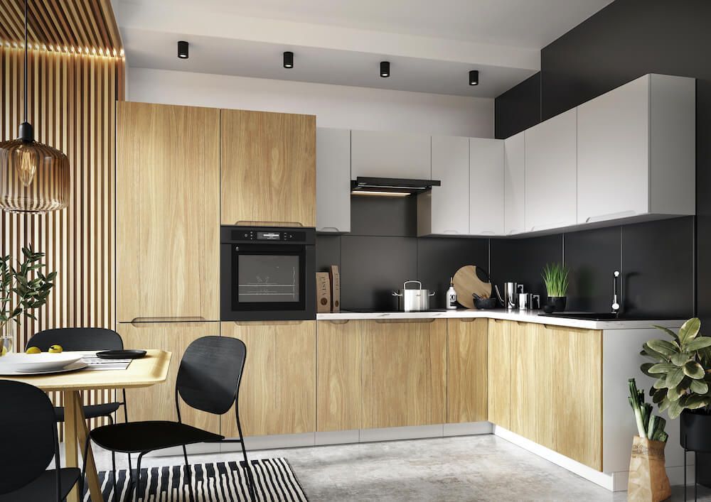 Virtuvės stilius – modernus | Virtuvės specifikacija – balta, pilka, ąžuolas | Matmenys: gylis [cm]>30 plotis [cm]>60 aukštis [cm]>68