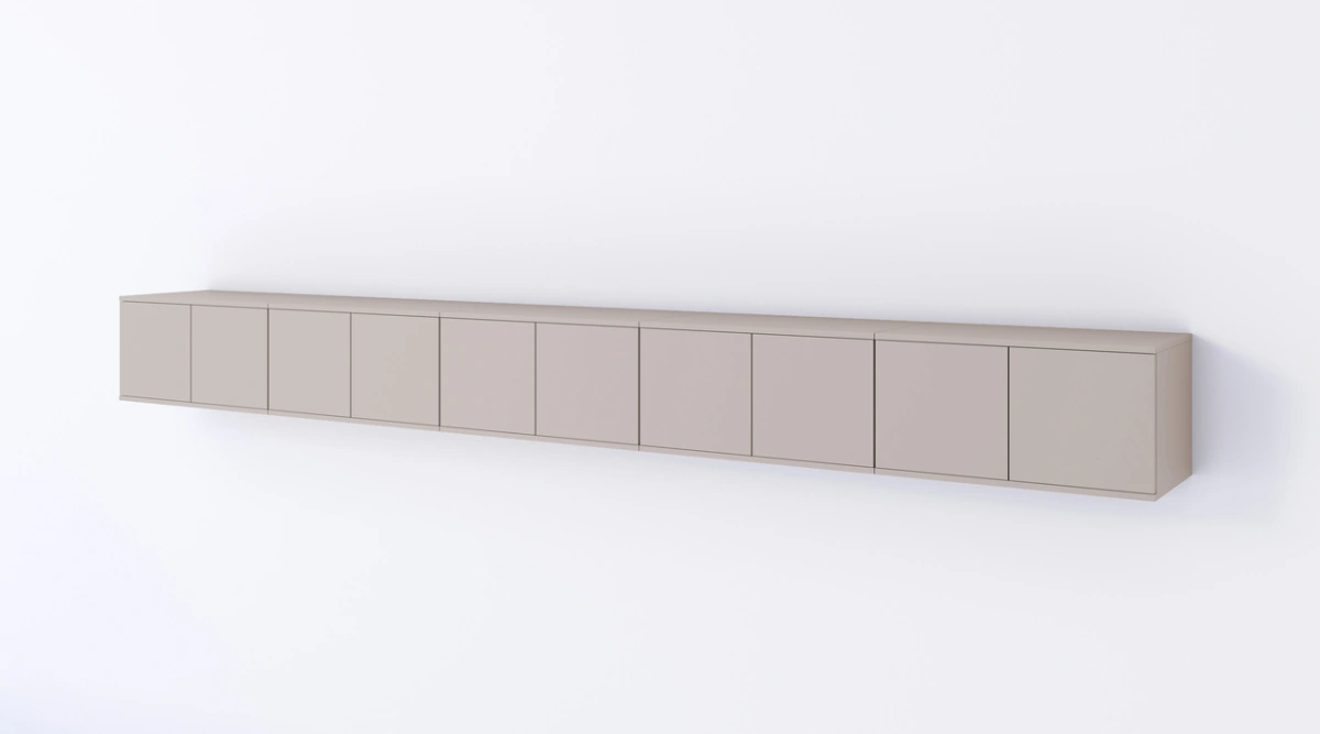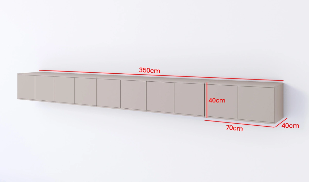 „Bianko“ 350 cm sieninė televizoriaus spintelė susideda iš penkių segmentų su lentynomis už fasadų.