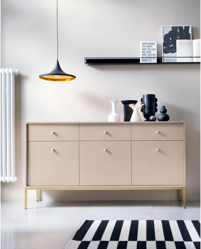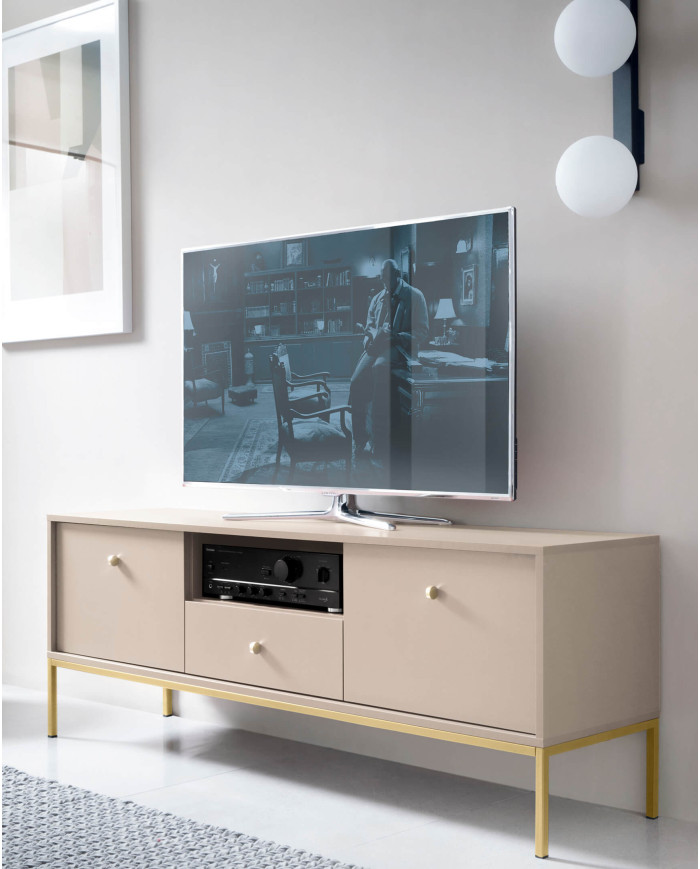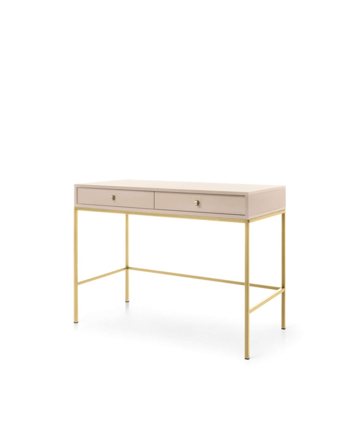„Mono MT104“ tualetinio staliuko konsolė išsiskiria unikalia forma, kurią pabrėžia aukštos, 65 cm auksinės kojelės, sujungtos su tvirtu metaliniu rėmu. Šis prestižinis baldas turi du elegantiškus stalčius, kurių smėlio spalvos fasadus puošia stilingos auksinės rankenėlės. Tualetinis staliukas pristatomas išardytas ir priklauso to paties pavadinimo baldų linijai. Taip pat galima įsigyti versiją su juodomis kojelėmis ir rėmu.