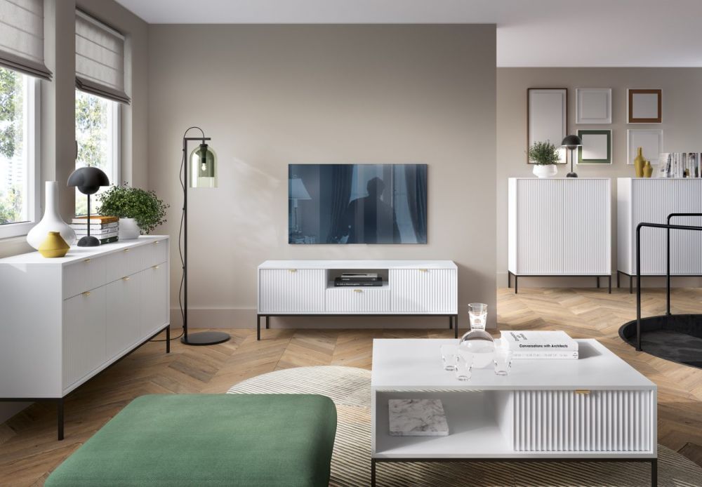 Priekinės dalys: 18 mm MDF plokštės, baltos spalvos su grioveliais