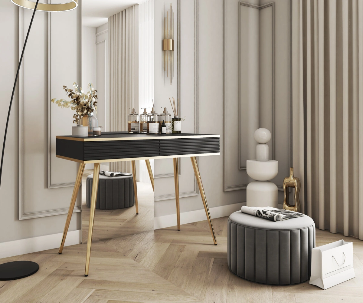 Juodas „Oro T102“ konsolinis tualetinis staliukas turi tvirtą stalviršį ir du stalčius.