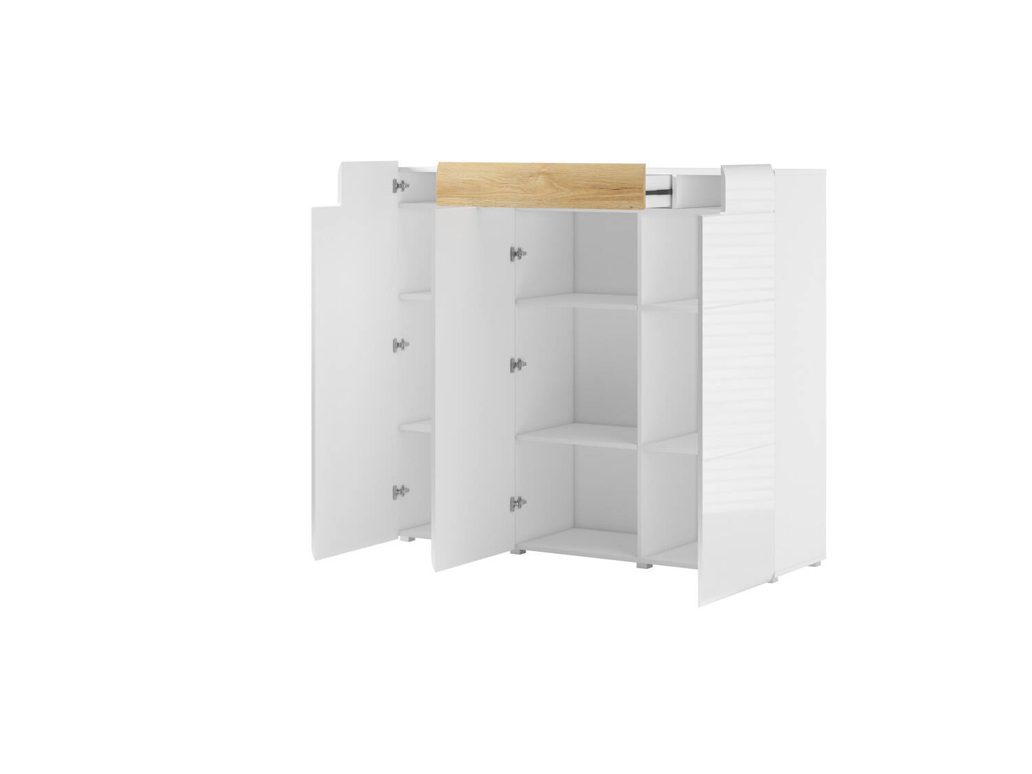 Išskirtinai elegantiška ir funkcionali „Helvetia“ „Toledo WM“ linijos aukšta komoda „3D1S“ – puikus pasirinkimas tiems, kurie vertina modernaus dizaino ir praktiškų sprendimų derinį. Pagaminta iš aukščiausios kokybės medžiagų, ji pasižymi išskirtiniu patvarumu ir estetika, kuri tarnaus ilgus metus. Blizgi balta apdaila ne tik suteikia gaminiui prabangos, bet ir vizualiai išplečia erdvę, įleisdama daugiau šviesos. Be to, MDF fasadai ir laminuotos baldų plokštės korpusas užtikrina tvirtą konstrukciją. „Toledo WM“ komoda turi tris dureles ir vieną stalčių, todėl daiktai yra ergonomiškai organizuoti. Aštuonios lentynos suteikia daug galimybių susidėti įvairaus dydžio daiktus.
