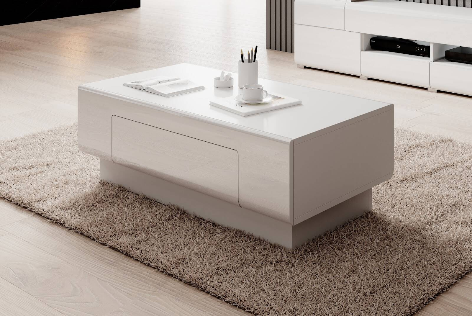 Ieškote kavos staliuko, kuris derintų aukštą estetiką ir praktiškumą? Garsaus „Helvetia“ prekės ženklo „Toledo WM“ kavos staliukas – tai baldas, kuris patenkins net ir išrankiausią skonį. Sukurtas galvojant apie modernų interjerą, jis puikiai tiks bet kurioje svetainėje, suteikdamas charakterio ir elegancijos. Unikalus „Toledo WM“ staliuko dizainas subtiliai derina baltą ir blizgesio spalvą, pabrėždamas minimalizmą ir modernumą. Stalčiaus priekis, pagamintas iš aukštos kokybės blizgios baltos MDF plokštės, suteikia gražumo ir praktiškumo. Baltas staliuko korpusas pagamintas iš patvarios laminuotos baldų plokštės, užtikrinančios ilgalaikį naudojimą. „Toledo WM“ staliukas pasižymi ne tik nuostabia išvaizda, bet ir išskirtiniu funkcionalumu. Jo matmenys – 110 cm pločio, 39 cm aukščio ir 60 cm gylio – idealiai tinka kasdieniam naudojimui. Praktiškas stalčius leidžia laikyti smulkius daiktus ir palaikyti tvarką, išlaikant erdvę švarią ir tvarkingą.