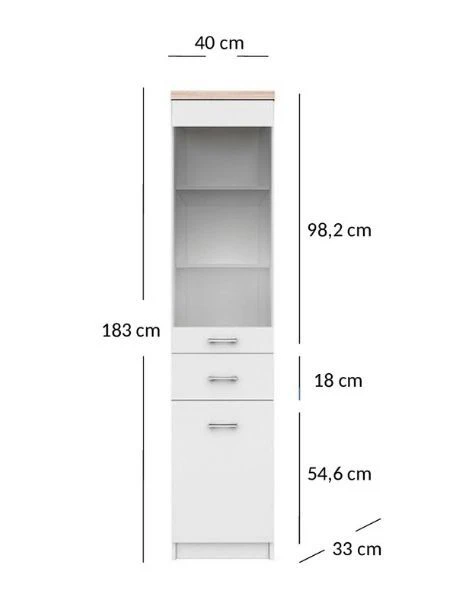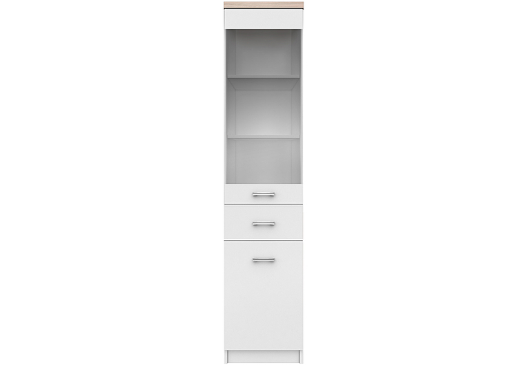 Ši stiklinė vitrina puikiai atrodo tiek pati savaime, tiek derinama su kitais baldais. Ji puikiai tinka dekoratyviniams daiktams eksponuoti svetainėje ar darbo kambaryje, taip pat stalo įrenginiams eksponuoti. Ši vitrina iš TOP MIX kolekcijos taip pat turi stalčių ir lentyną su uždara priekine dalimi. Paprastas dizainas patiks tiems, kurie mėgsta santūrų interjero dizainą.