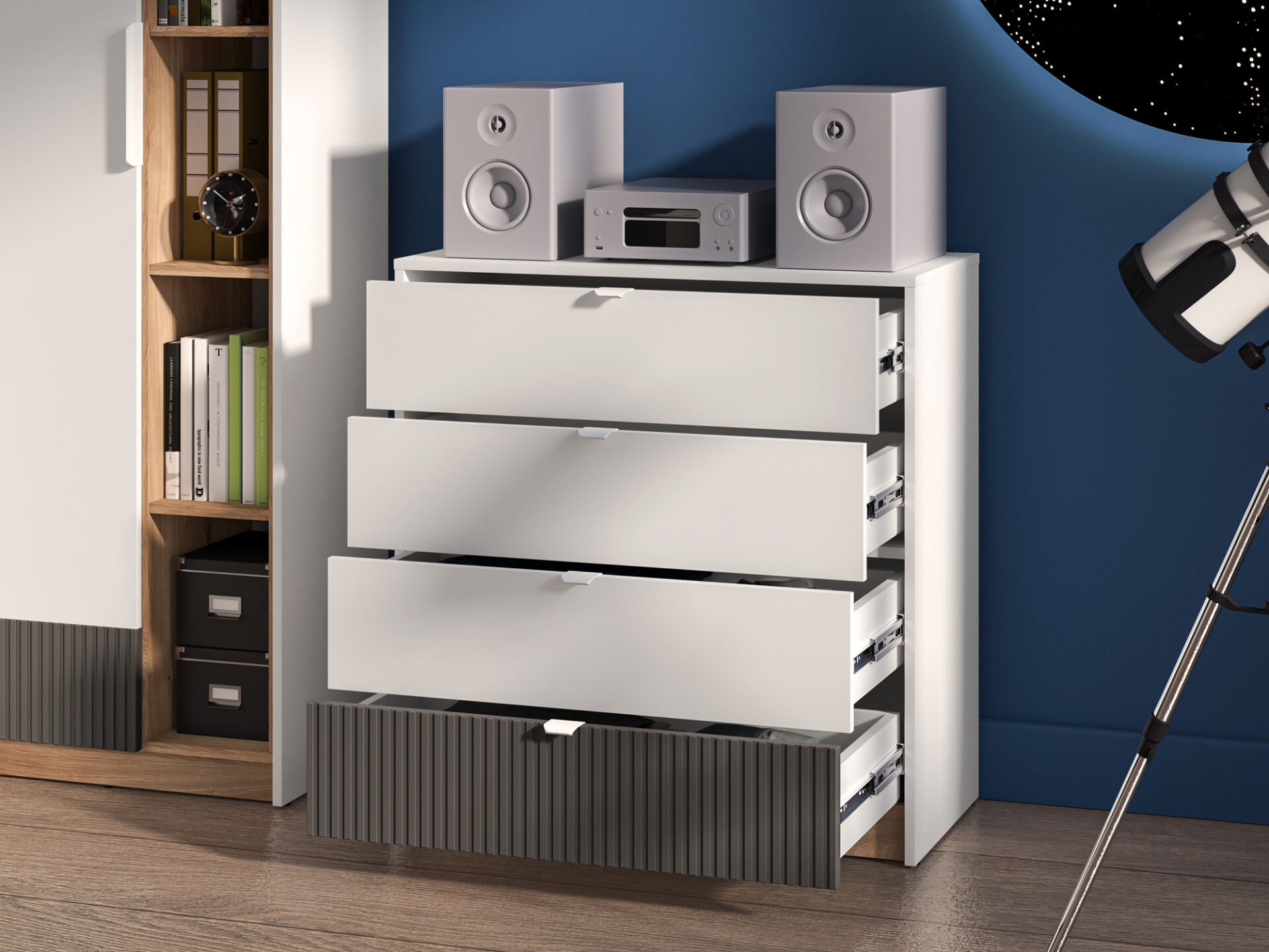 Komoda „Torino 06“ suteikia daug vietos daiktams susidėti ir leidžia eksponuoti mėgstamiausius daiktus. Joje yra keturi platūs ir erdvūs stalčiai. Viso ištraukimo sistema dar labiau palengvina prieigą prie drabužių, apatinių drabužių ir kojinių. Platus stalviršis, kurio optimalus aukštis – 86 cm, leidžia kasdien mėgautis mėgstamų įtaisų vaizdu. Ant jo galite eksponuoti nuotraukų rėmelius, figūrėlių kolekciją ar atostogų suvenyrus. Optimalus komodos dydis leidžia lengvai palaikyti tvarką net ir mažoje erdvėje. Be praktinių savybių, „Torino“ komoda taip pat yra madingas ir modernus interjero dizaino elementas.
