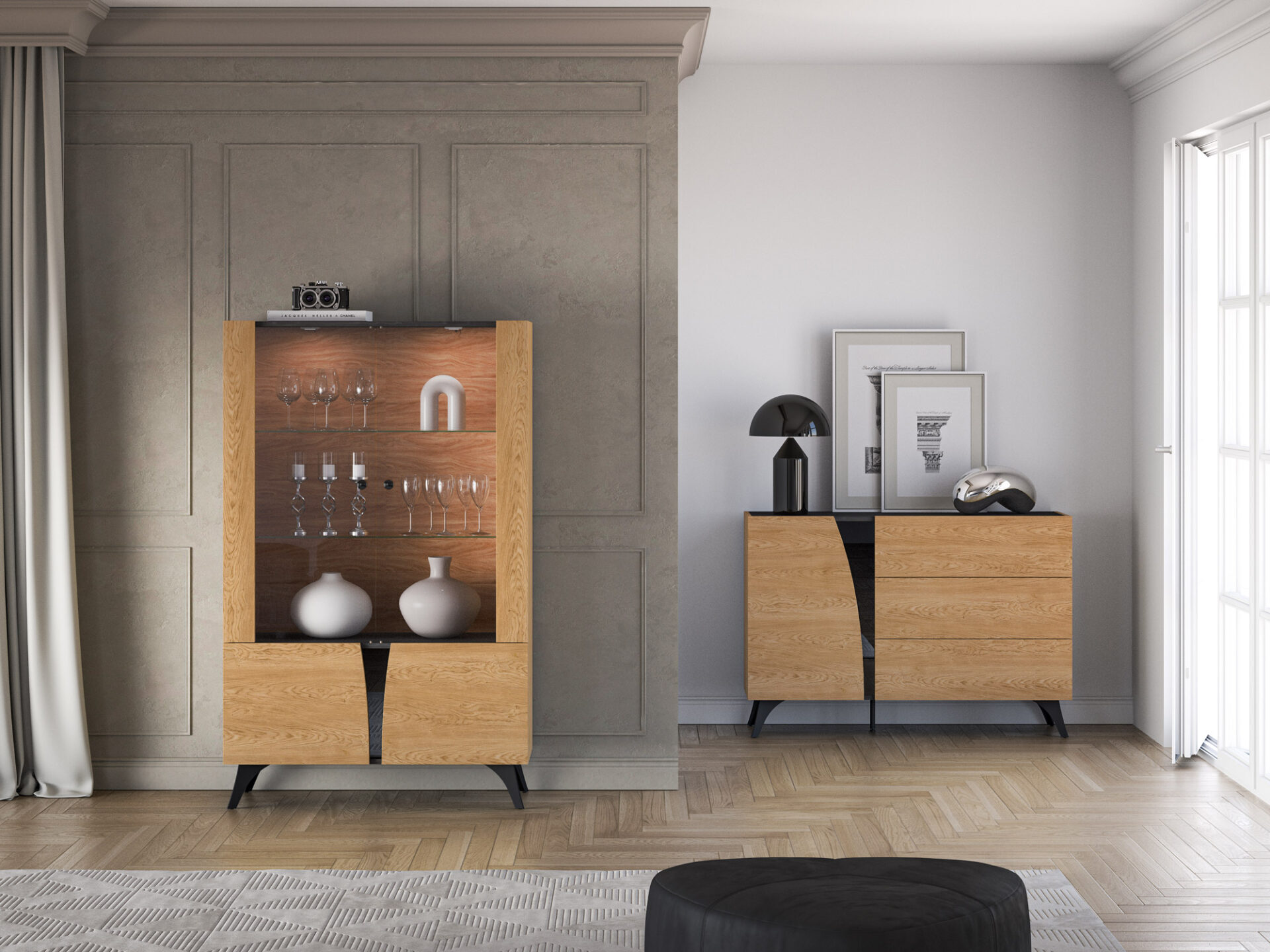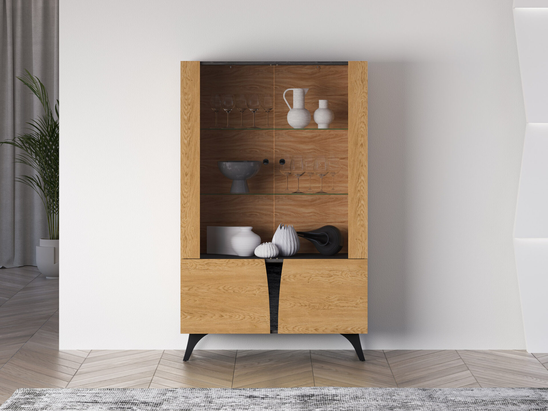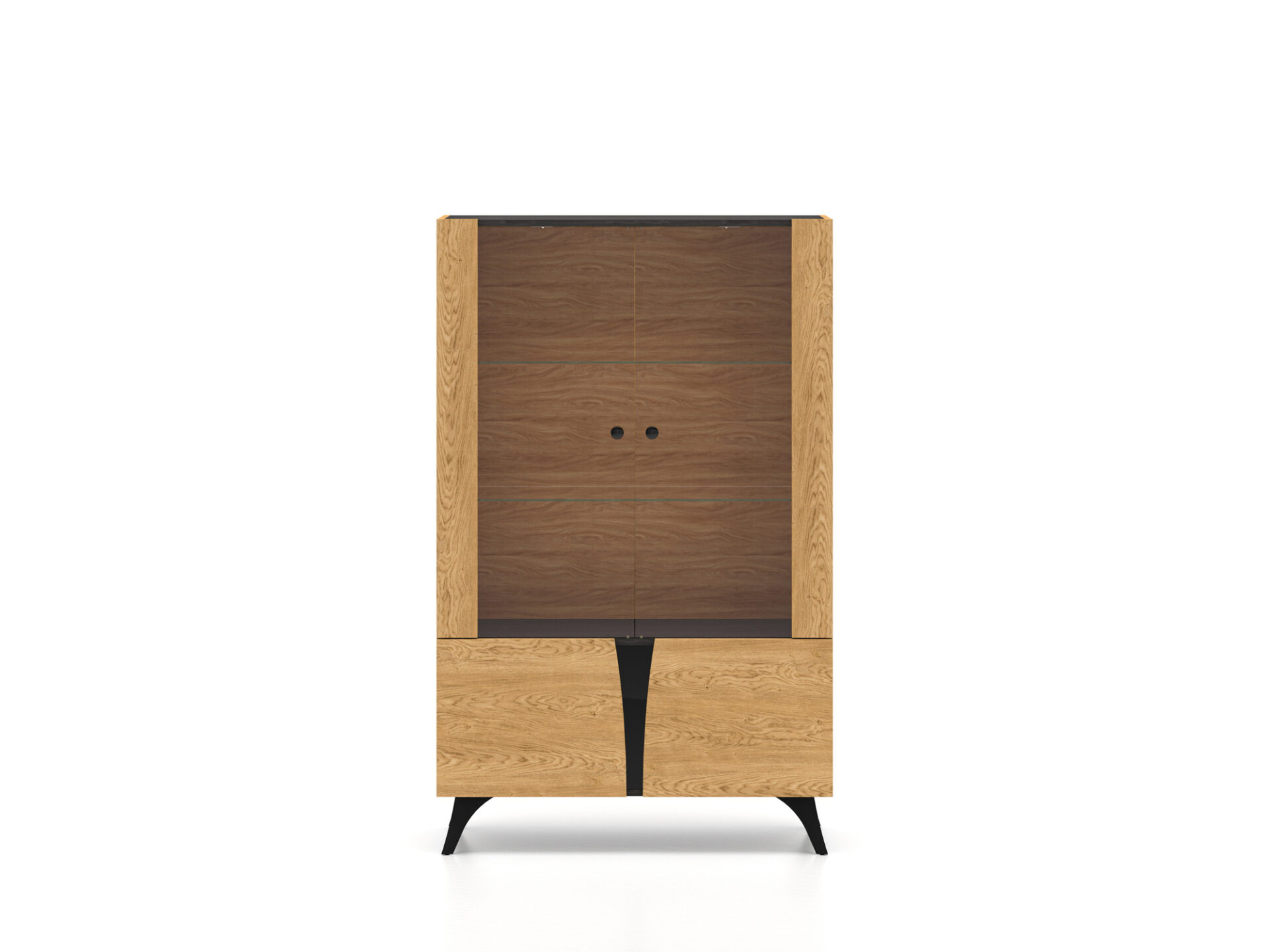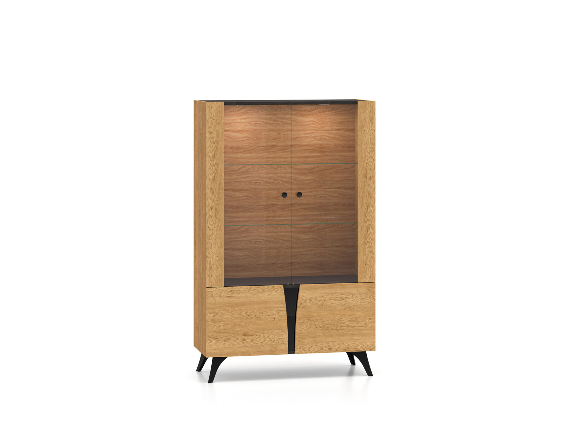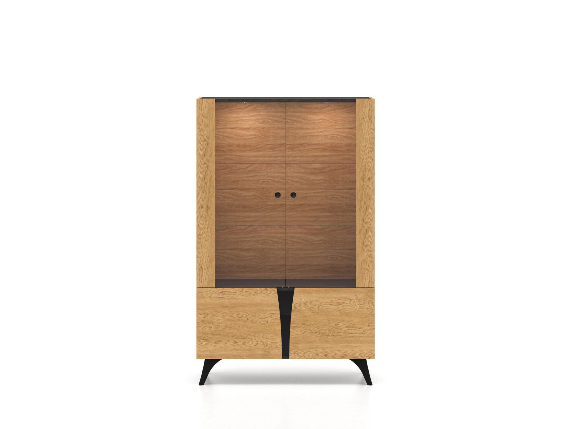 „Toscania 03“ vitrina – tai baldas, leidžiantis jums eksponuoti mėgstamiausius daiktus. Dvi stiklinės lentynos padalija erdvę į tris plačias nišas su dvigubomis durelėmis. Galite eksponuoti taures, porceliano kolekciją ar suvenyrus iš kelionių. Jei norite dar labiau išryškinti savo mėgstamiausius daiktus, rinkitės mūsų LED lentynų apšvietimą. Spintelės sklindanti šviesa subtiliai sušildys visą jūsų interjerą. Apatinėje spintelės dalyje yra erdvi lentyna, puikiai tinkanti stalo įrankiams ar staltiesėms laikyti. „Toscania 03“ vitrina derina aukštą funkcionalumą ir šiuolaikišką dizainą. Šis modernus stilius pateisins jūsų lūkesčius.